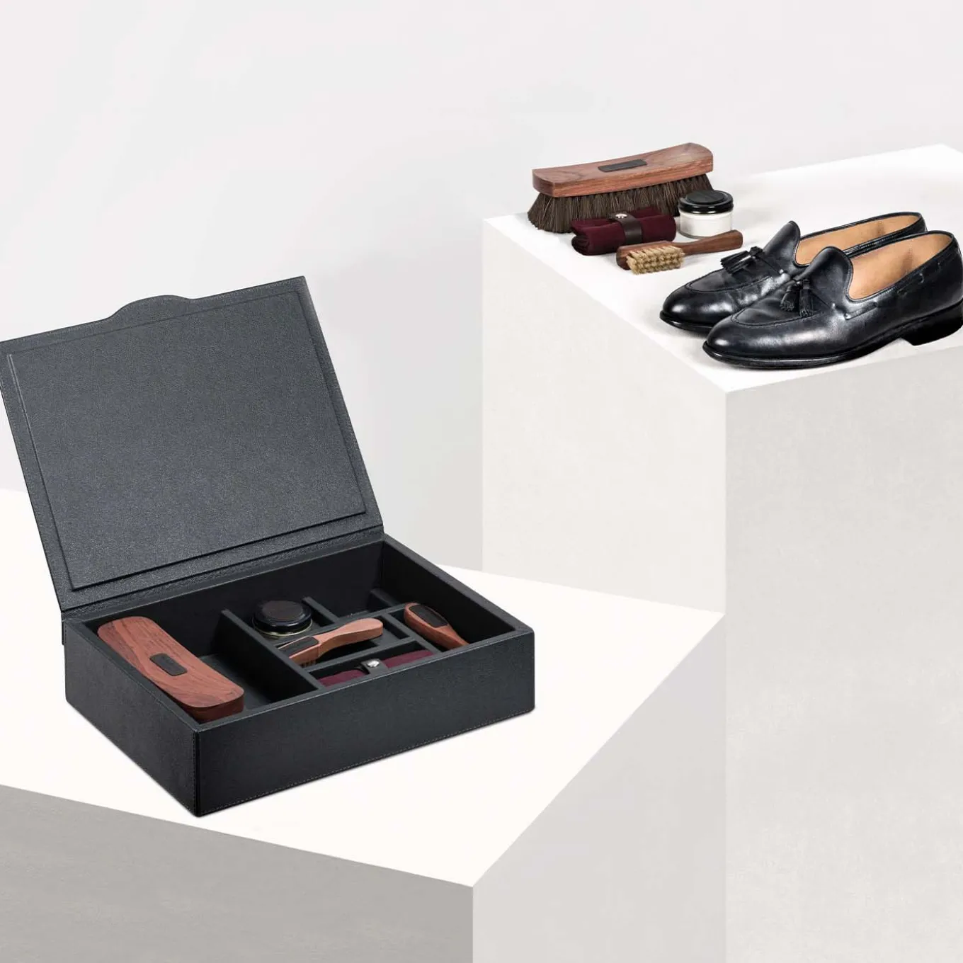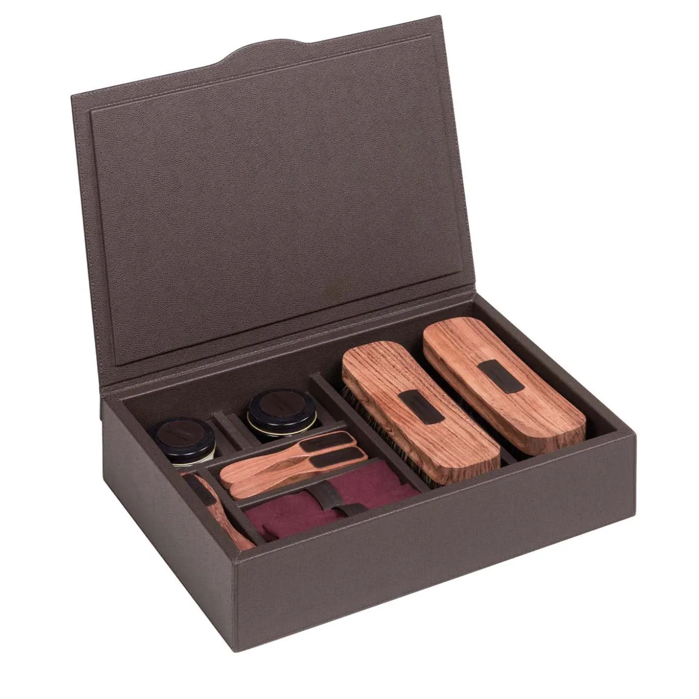 Box with leather-covered wood structure and partitions, provided with hinged lid. Set equipped with the following tools: 2 shine brushes with horsehair bristles, 2 polish application brushes with horsehair bristles, 1 mini brush with synthetic and brass bristles for suede, 2 soft shine cloths, 2 shoe polish pastes. All brushes have a Bubinga wood structure.