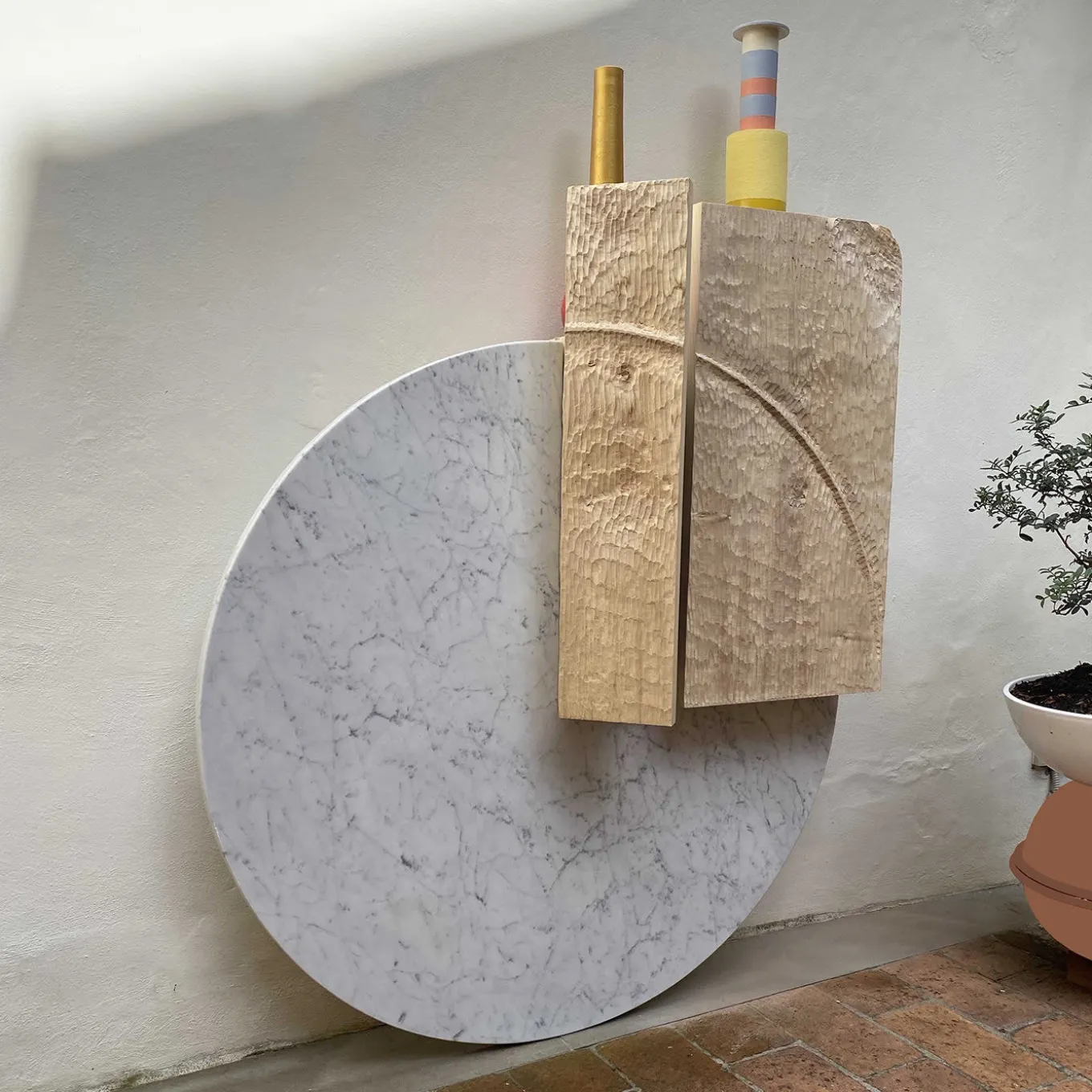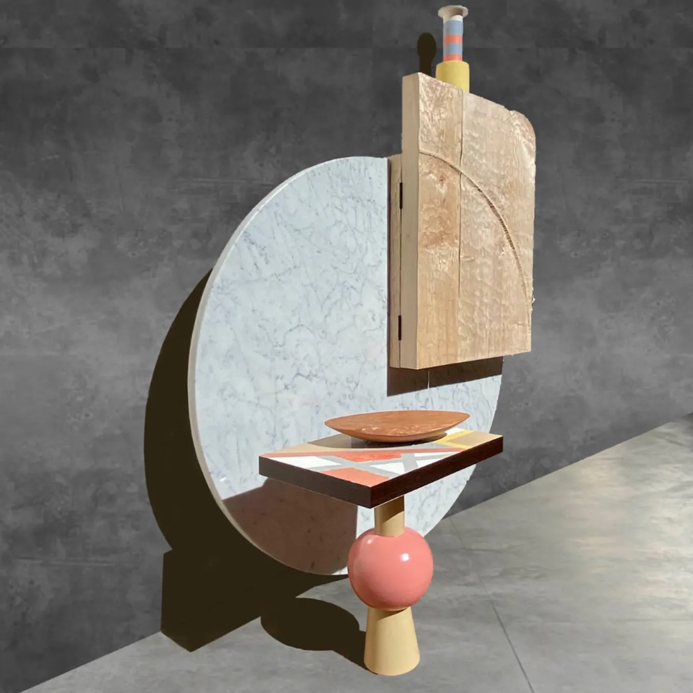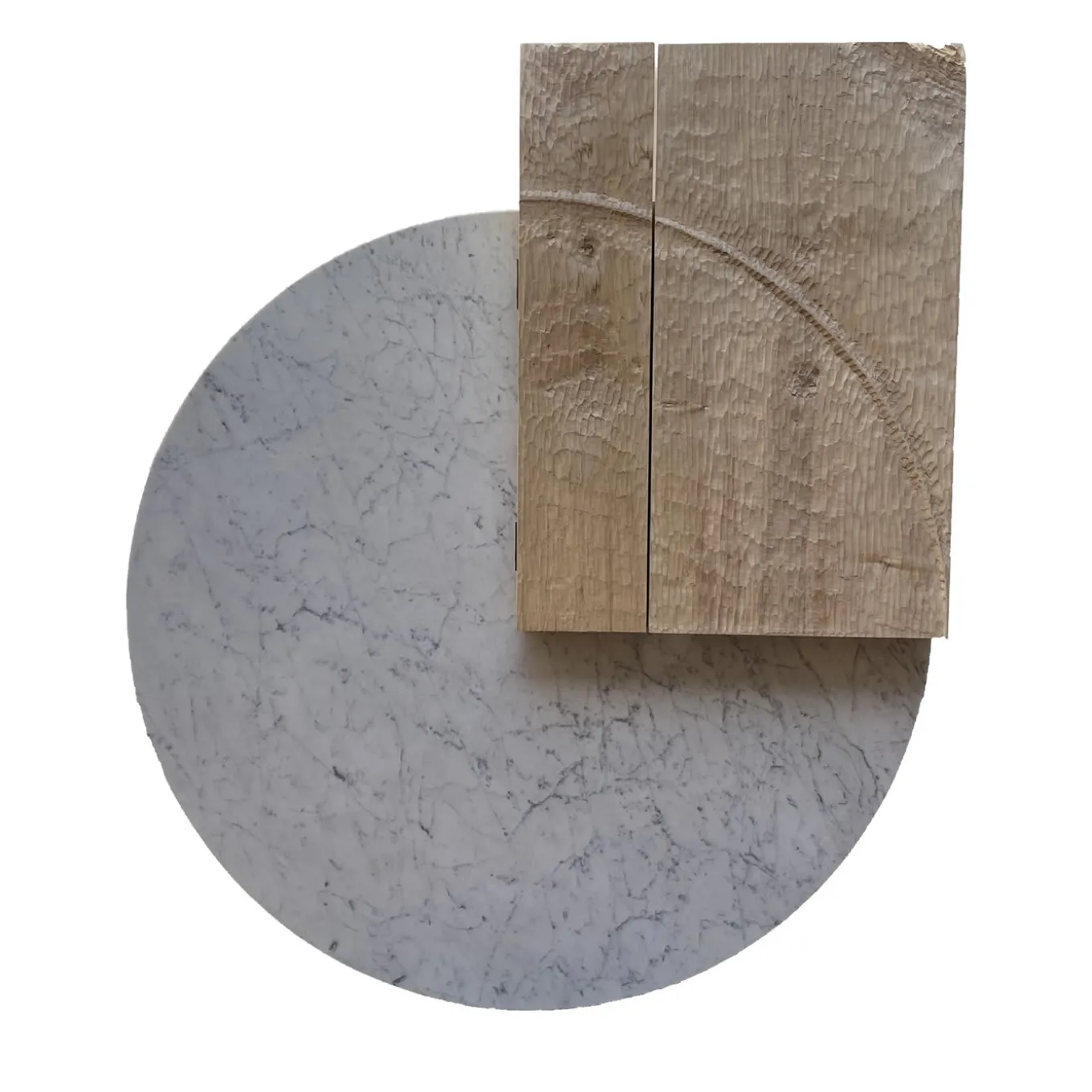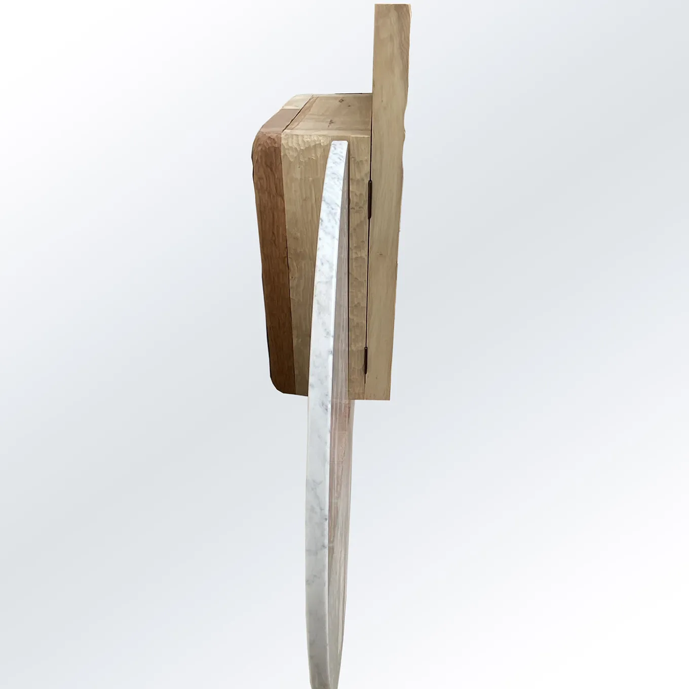A bold combination of materials brimming with architectural flair define this sideboard by designer Pietro Meccani. The sturdiness of the polished white Carrara marble circle and warmth of the hand-sculpted maple cupboard create a stunning visual contrast that will enhance any interior. The two, differently sized doors open to reveal a single-shelved interior with rich, cherry wood inserts.
