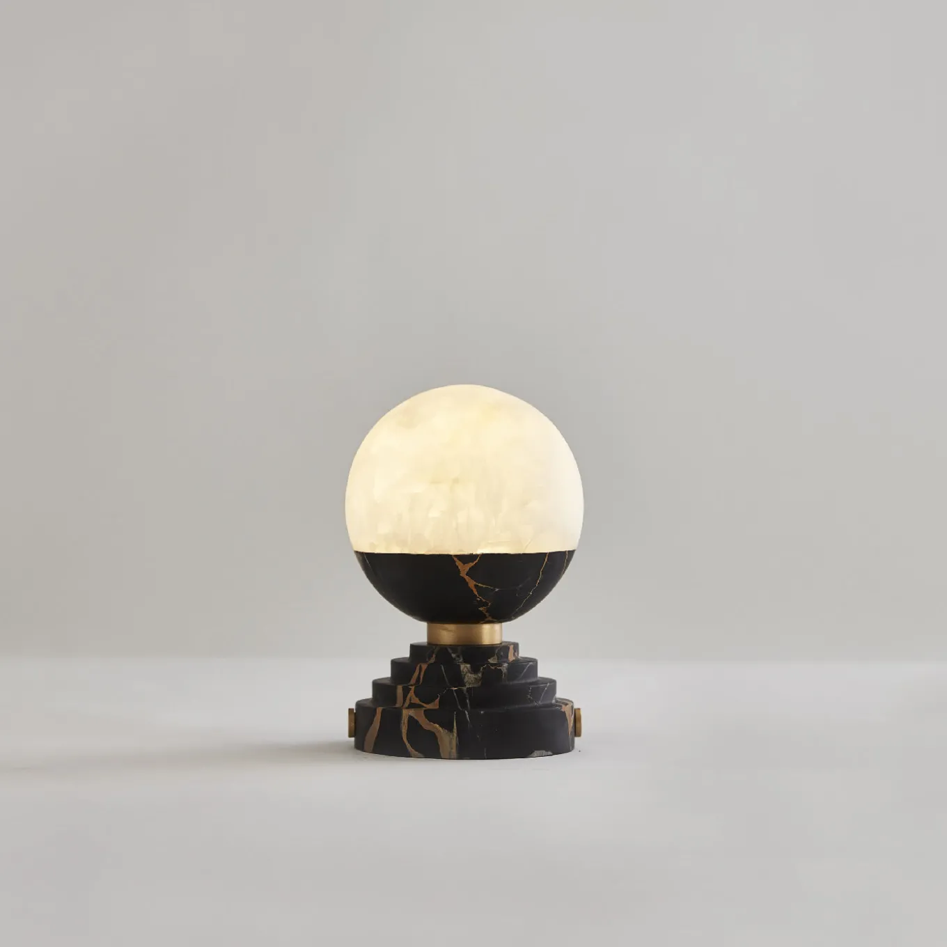 Capable of bringing the unmistakable charm of the moon to any surface, this exquisite table lamp is designed to be easily turned into a sconce or a pendant lamp. A tiered, circular base in Portoro marble, the same material gracing the diffuser’s low section, supports the spherical shade of white onyx, whose textural characteristics are enhanced by the G9 LED bulb housed within reminding of an enchanting full moon. Please ask the Concierge for further technical details and for other prized marble variants.
