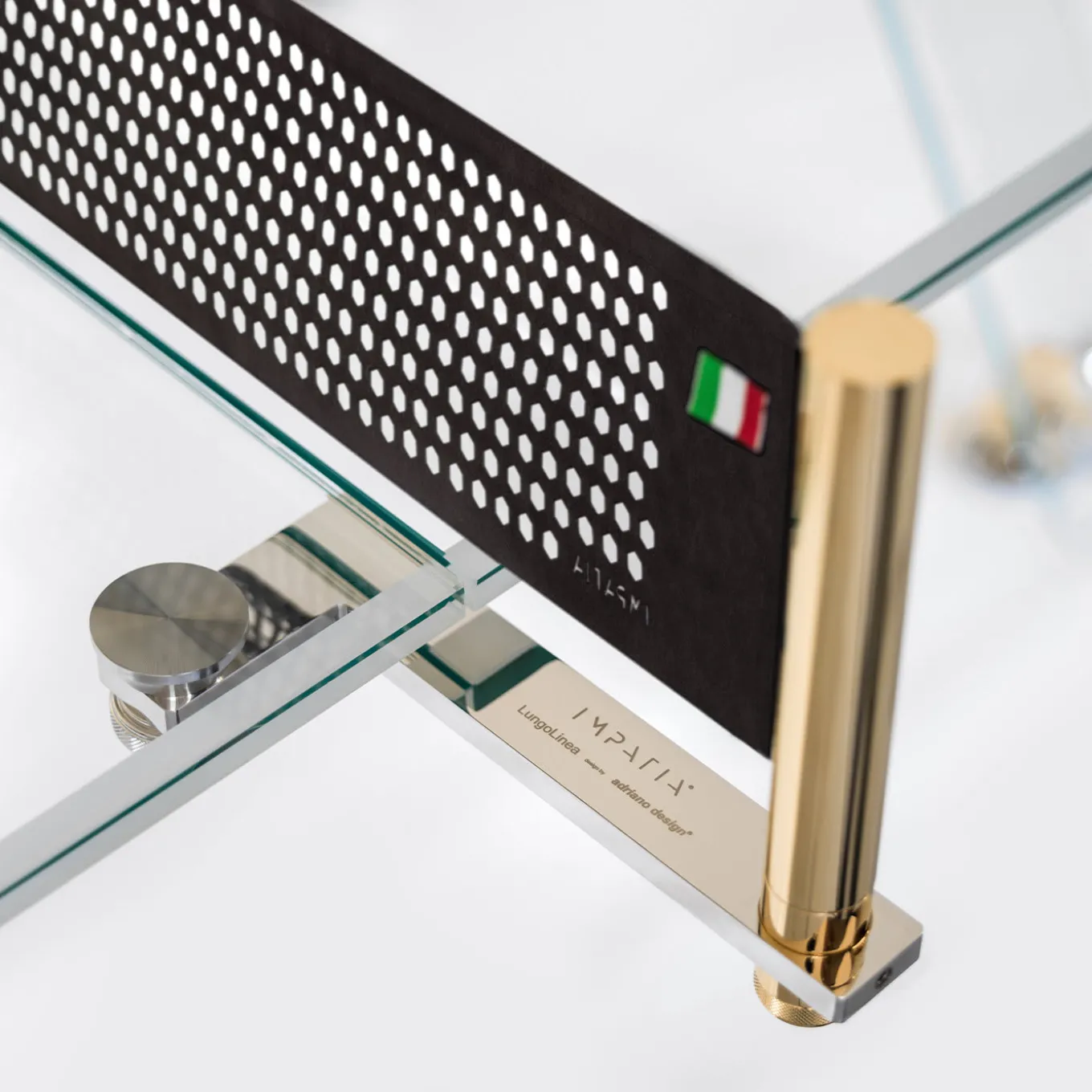 The Premium Gold Edition of the Lungolinea ping-pong table takes the world of luxury to a whole new level. It features handcrafted, 24k gold, connecting joints made by master Italian goldsmiths. Includes one table-tennis net kit, four professional rackets and ten pro-grade balls.