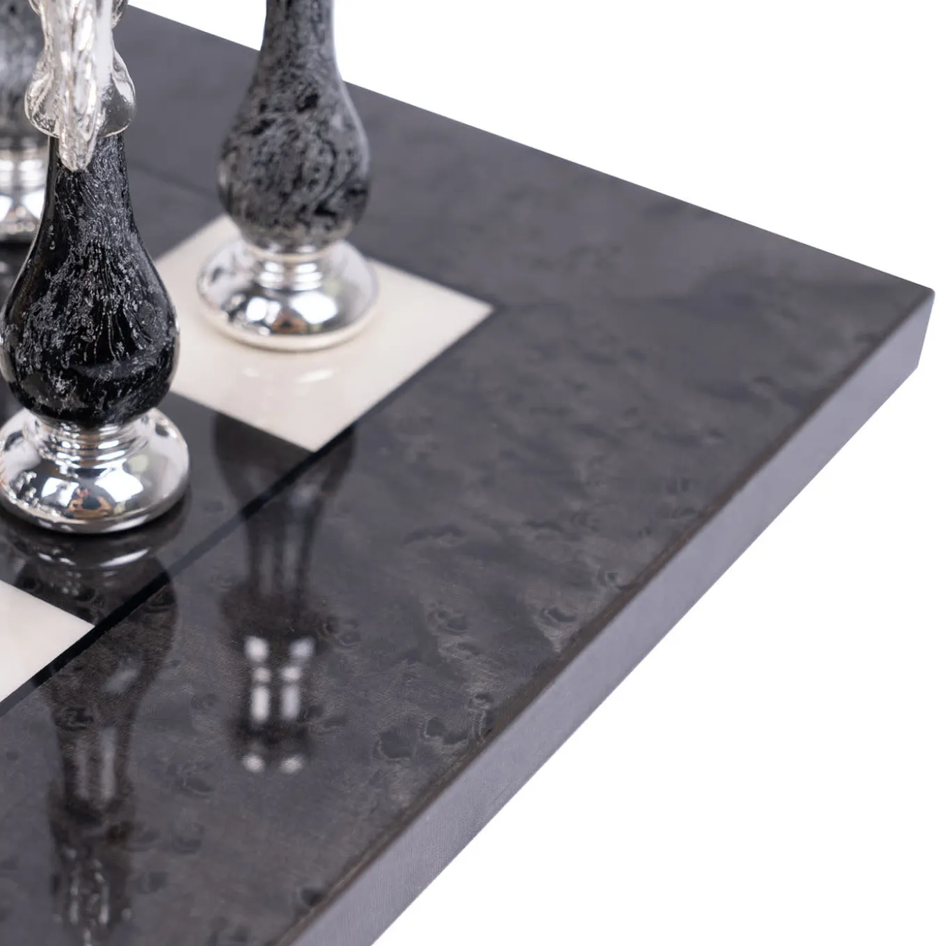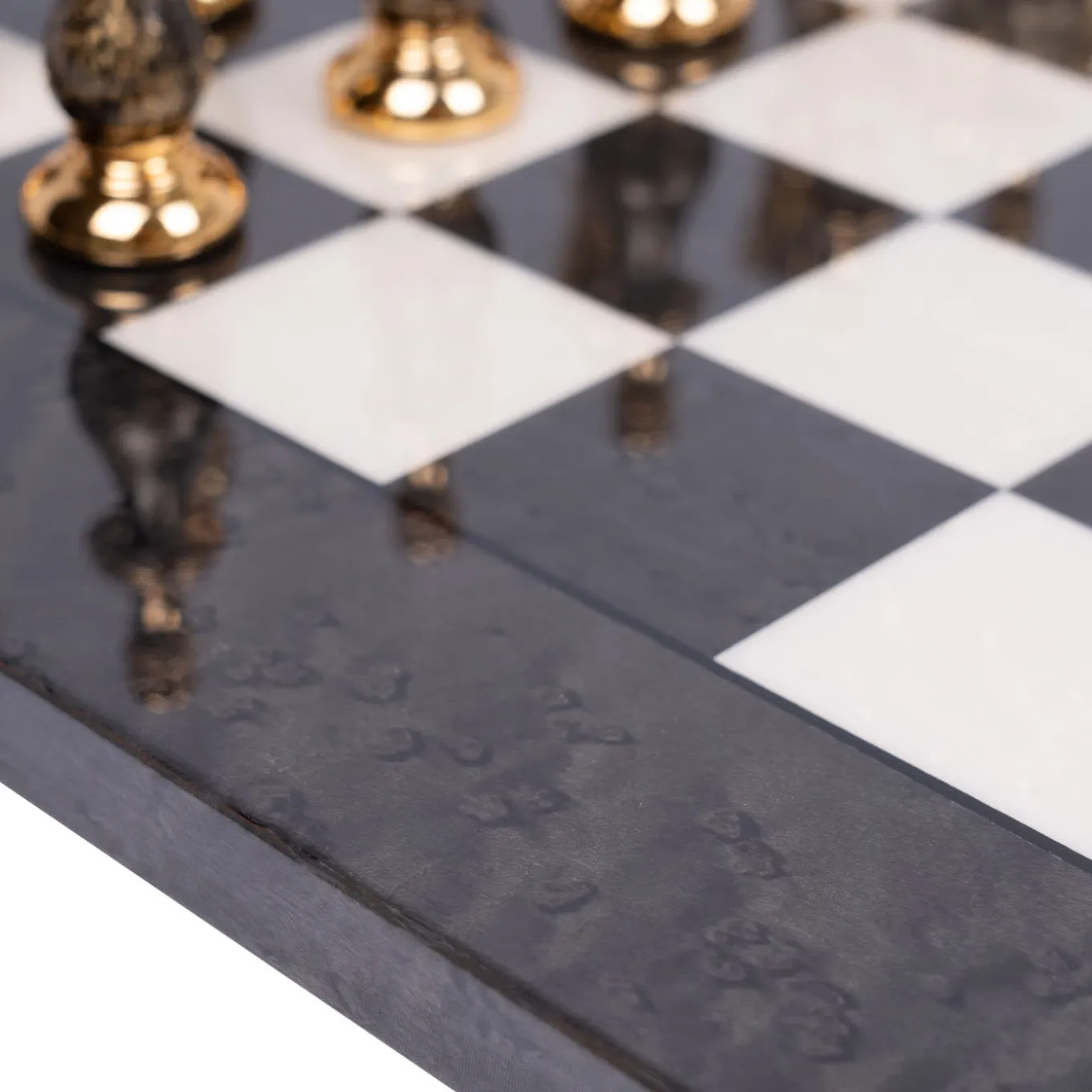 Exuding exquisite craftsmanship, this chess set features solid brass pieces plated in gold and silver, complemented by hand-distressed wood. The board, crafted from gray and white Earble, showcases meticulous inlay work. With a king height of 10cm and a board size of 51x51x2.0cm, this set epitomizes luxury and elegance. Certified Made in Italy, this set is a masterpiece that adds an element of refined beauty to any space.