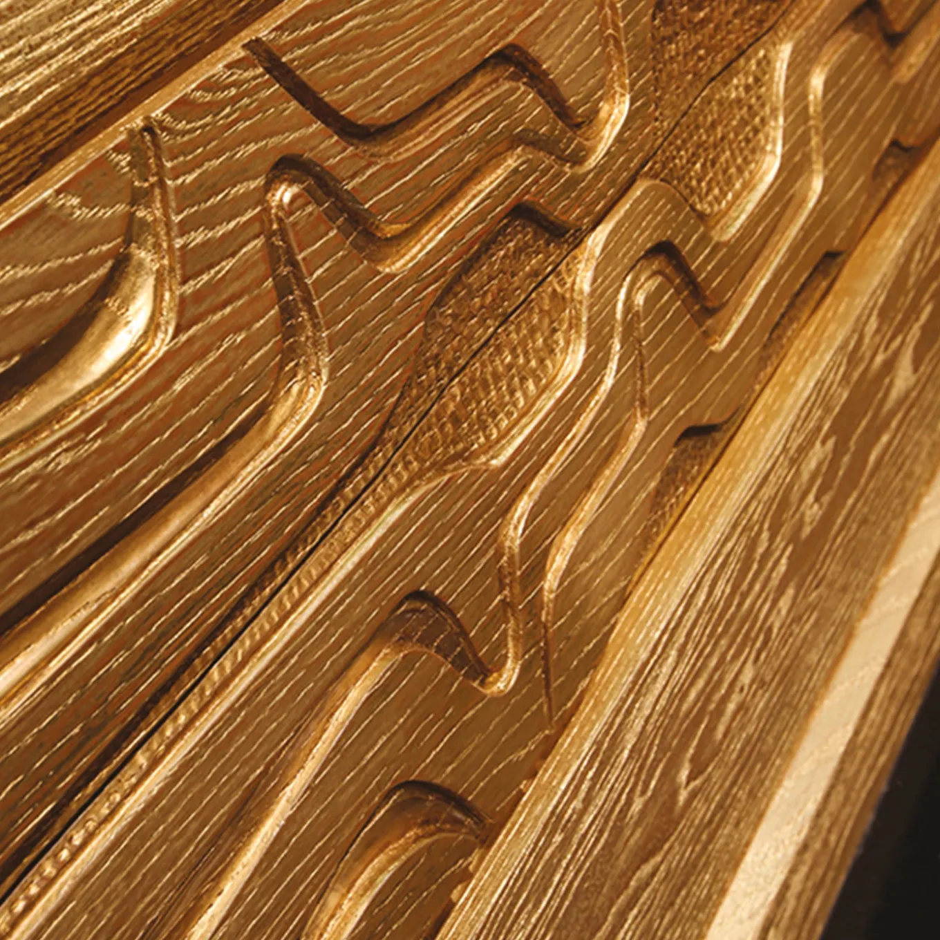 Rigorous wooden volumes made endlessly elegant by enveloping them with luminous, sand-blasted gold leaf mark the Art Deco-inspired design of this precious dresser crafted from intensely-grained oak. Seemingly suspended over a matching base, its storage unit is equipped with drawers minutely carved to obtain a sinuous and organic design that appears framed by the structure’s sculpted edges. The front can also be painted with gold metallic paint upon request to the Concierge.