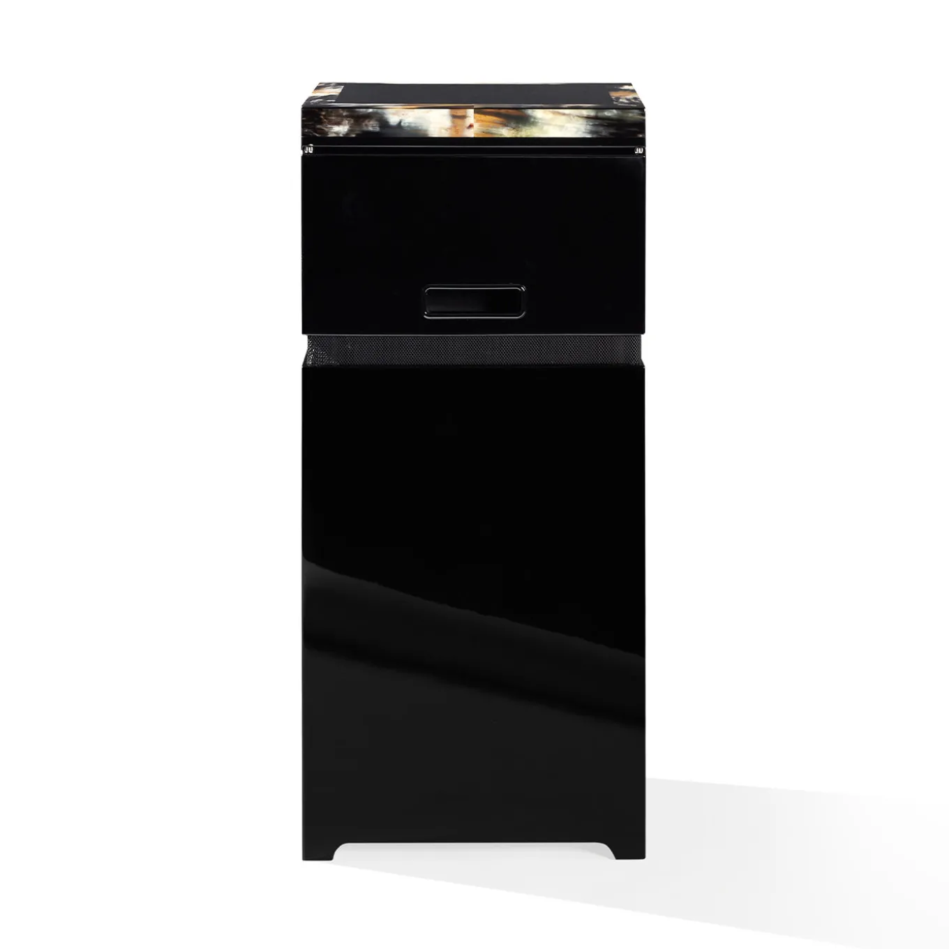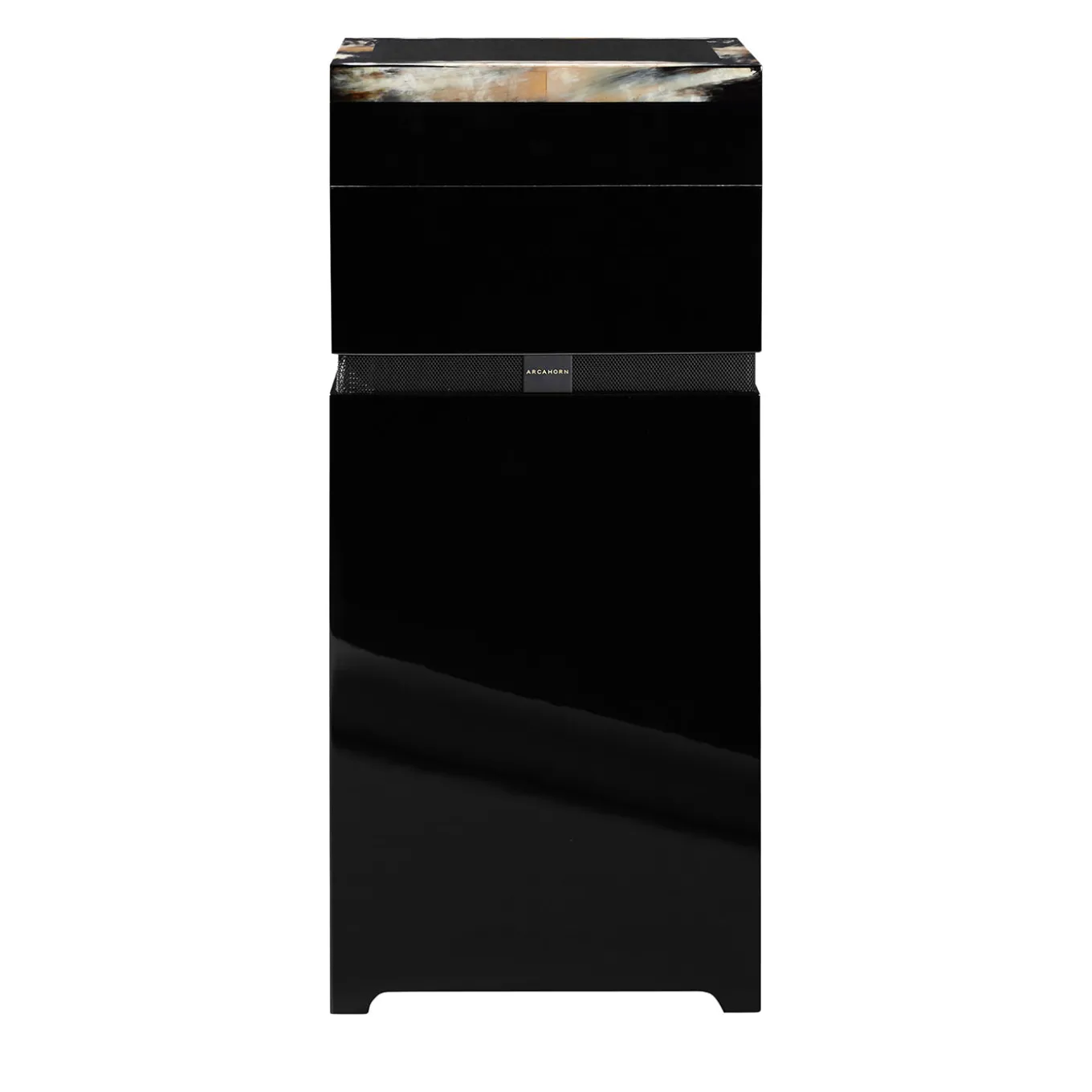 The lyra speaker features an all-around sound system housed in glossy black lacquered wood, highlighting clean lines and sculptural geometry. Natural horn inlays on the top add a unique textural contrast and elevate the design with a distinctive touch. This speaker balances meticulous detail with advanced sound technology, making it a refined audio solution for sophisticated interiors.