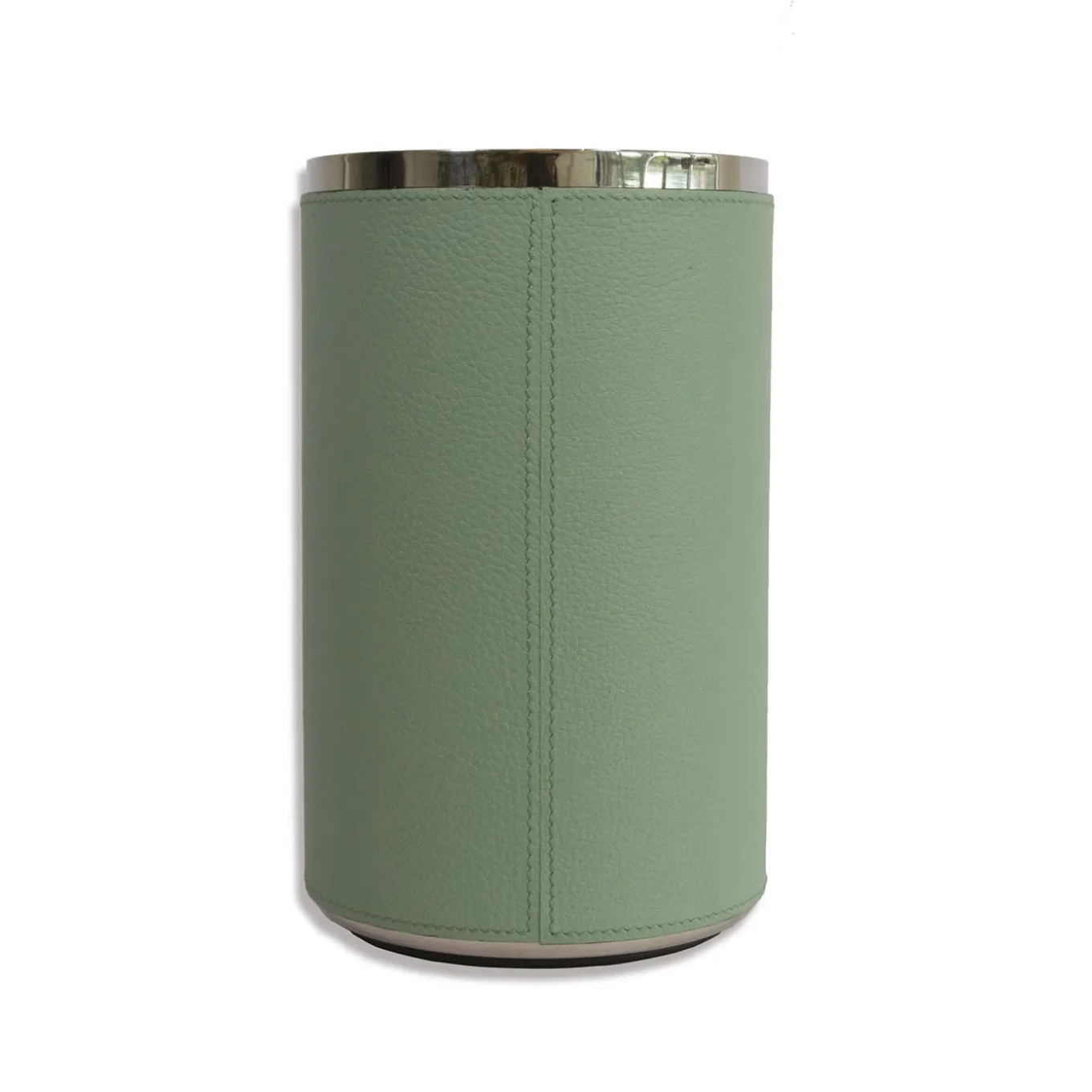 Clean and elegant in the classic cylindrical shape defining it, this gorgeous wine cooler will make an exquisite addition to a contemporary decor. Fashioned of stainless steel, it is dressed with a precious green full-grain leather upholstery. Also available in 13 other colors, please check the Artemest catalog for details.