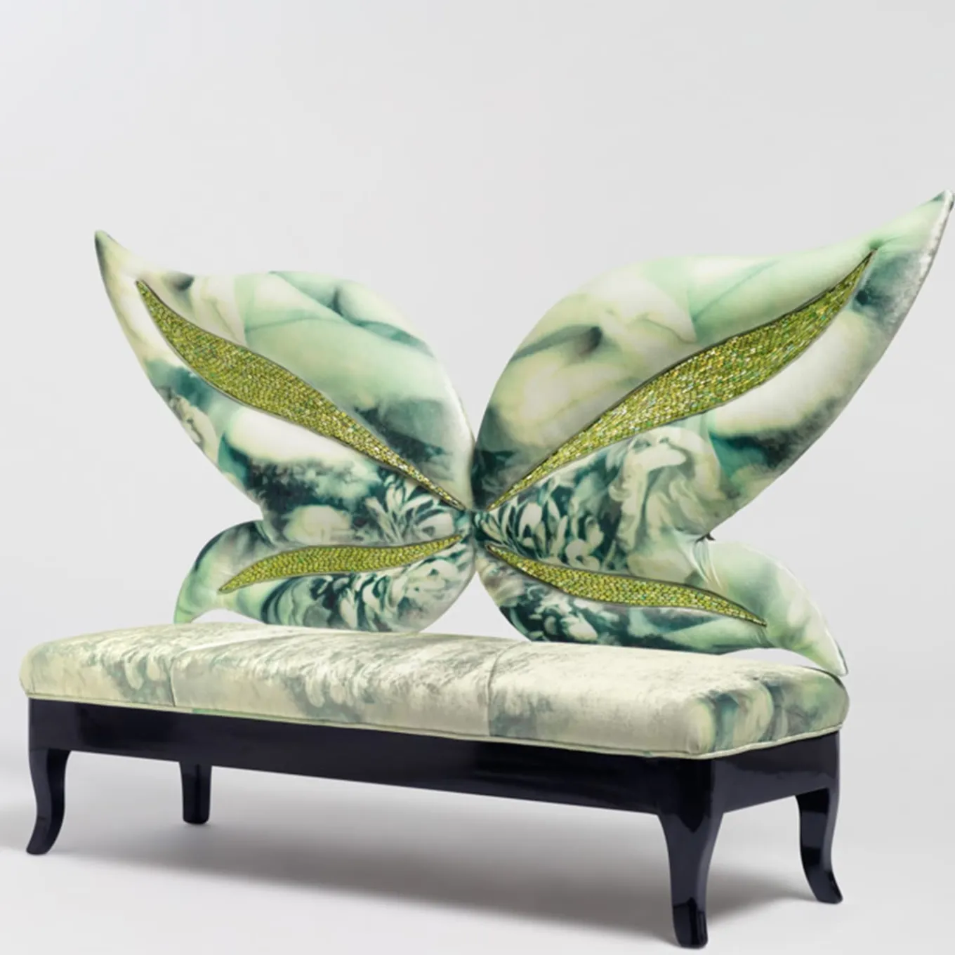Like a butterfly whose wings give a sense of lightness, the detail of minute mosaic tiles on the back of this sofa create a sense of depth and ethereal elegance at the same time.