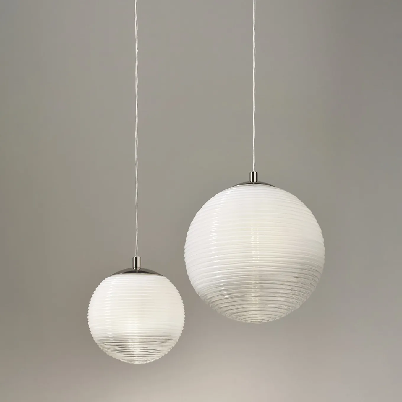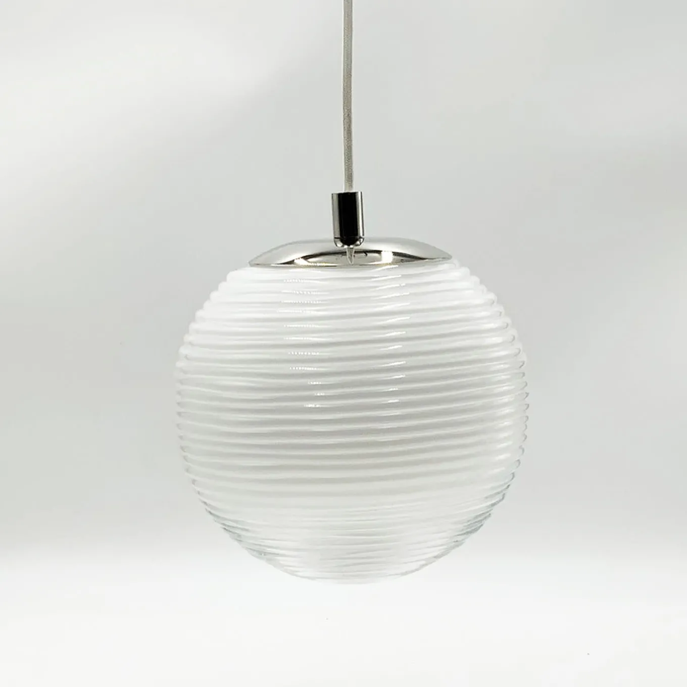 This refined pendant lamp of contemporary inspiration stands out for a texture of quiet waves enlivening the milky spherical shade in mouth-blown Murano glass. Encasing an E27 LED bulb (220/240 V) and fitted to a glossy-finished metal frame, the diffuser allows for a homogeneous and charming casting of the light in the surroundings. A larger version is also available, please consult the Artemest catalog for details.