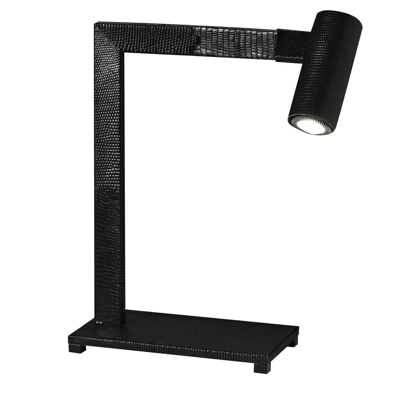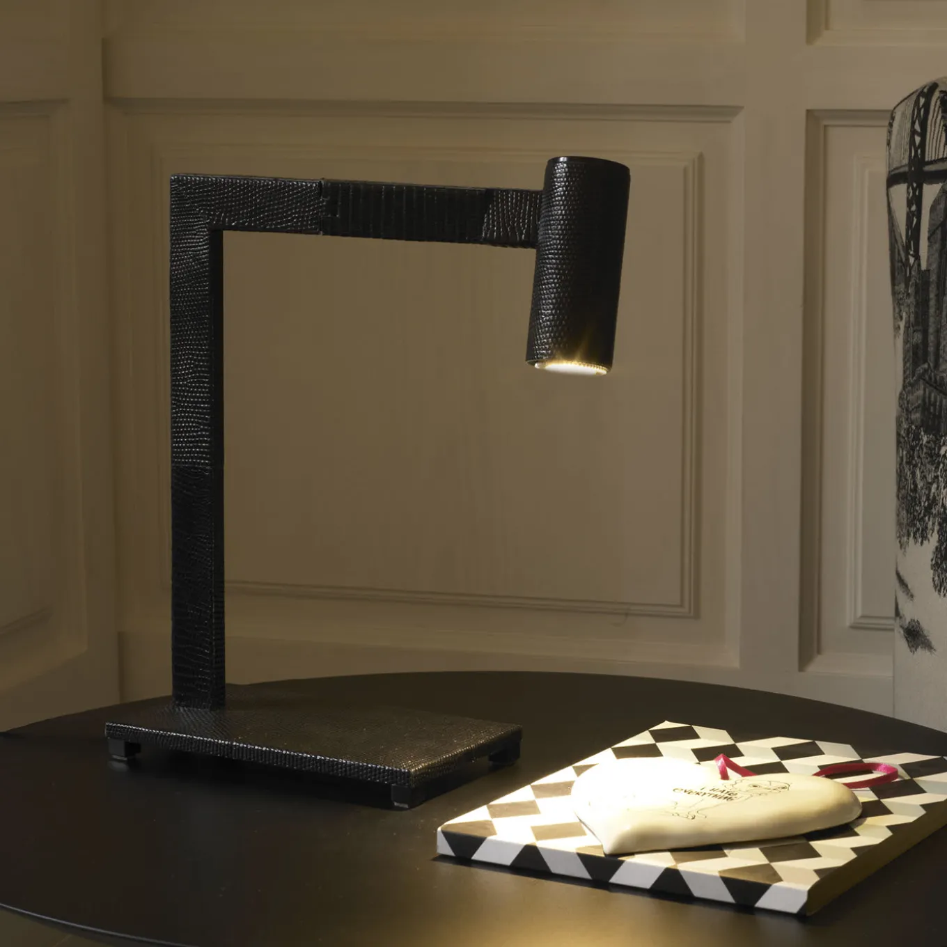 Unique textures, popping colors, and minimalist silhouettes are the distinctive traits of the Mahari collection. Part of this collection, this table lamp boasts an elegant shape comprising a rectangular base that supports a two-piece structure and an adjustable cylindrical shade with one 1.5W 3000K LED bulb. The standout feature of this piece is the black iguana leather of its upholstery. The effect is striking and will make a statement in any room in the house. For customization, please contact the Concierge.