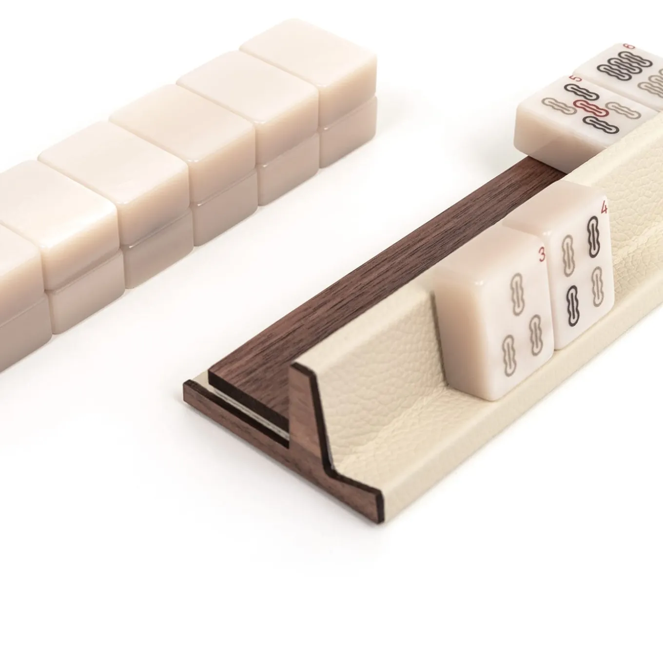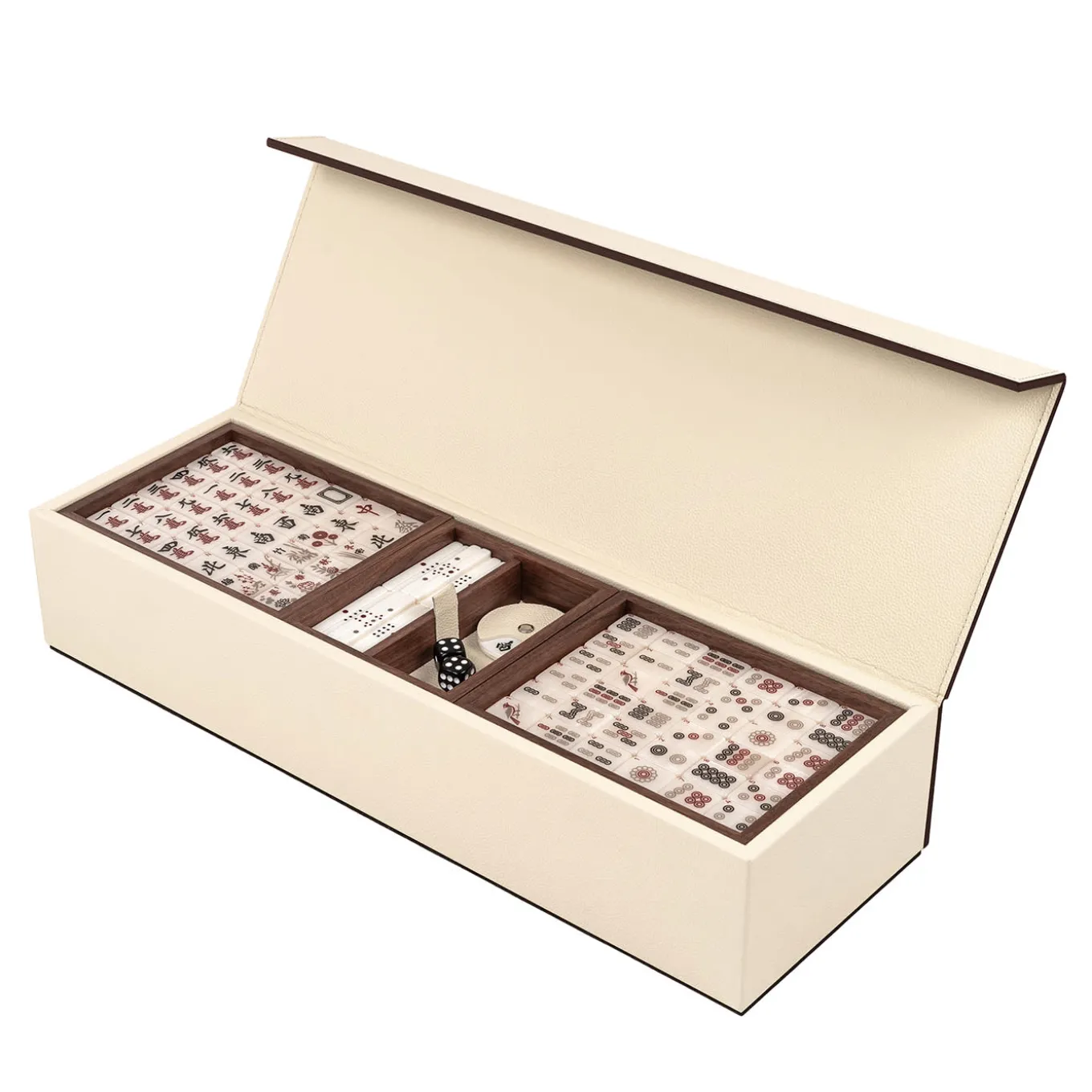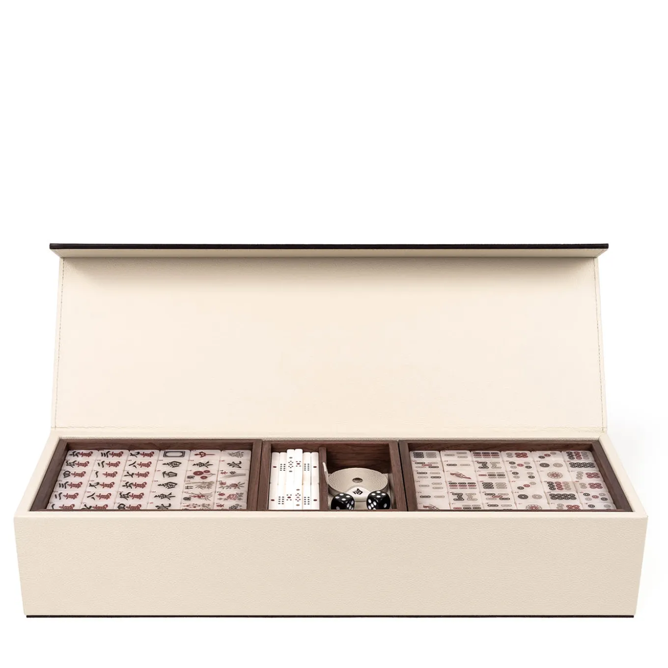 A contemporary take on a timeless classic, the Mahjong Board Game by Pinetti is a precious restyling of one of the most popular games in the world. Handcrafted of walnut wood, it features a magnet-equipped lid, and a first-rate cream-colored Cairo leather upholstery. The game set comprises 144 pearled tiles, 88 sticks, four racks and one swivel indicator. Please consult the Concierge for further details.