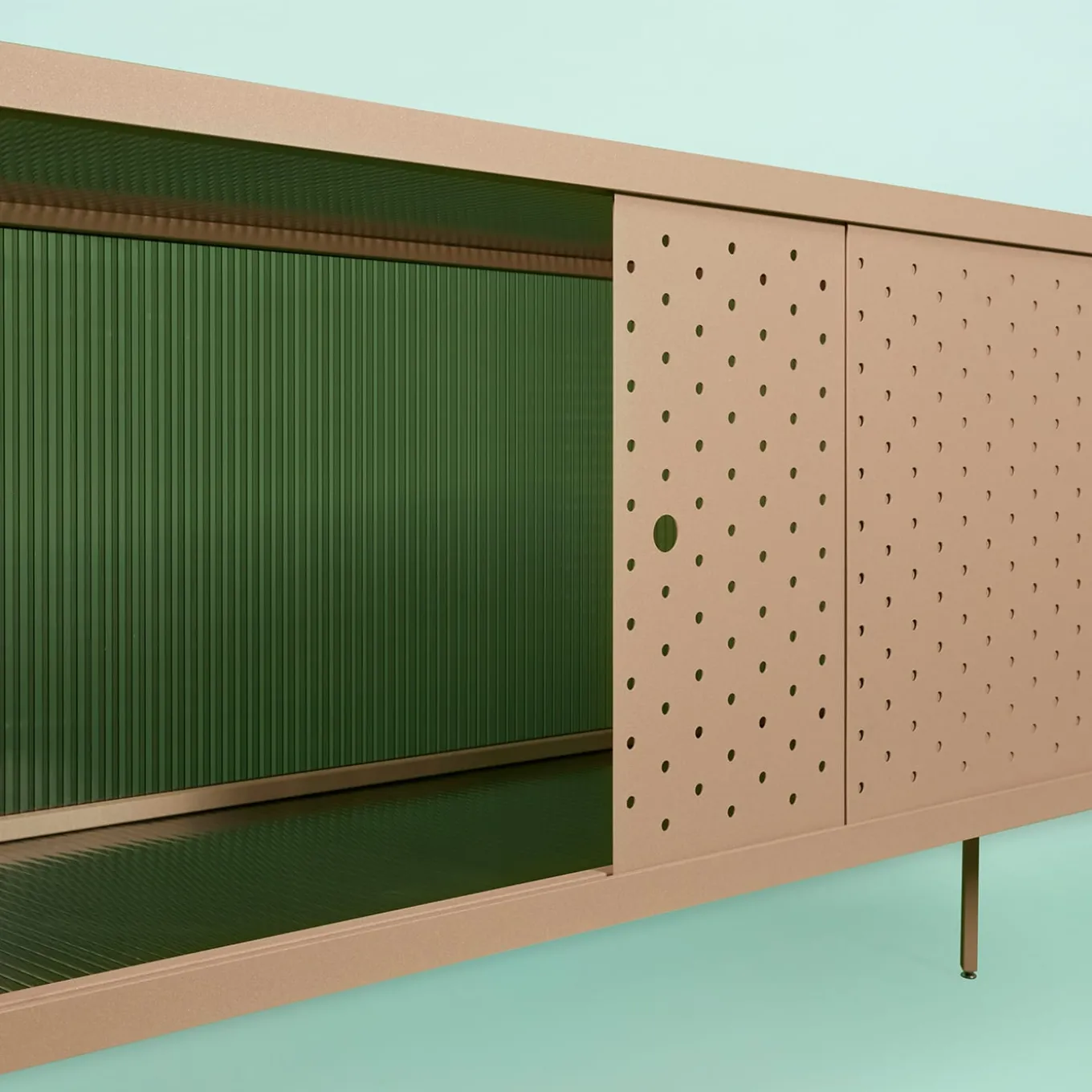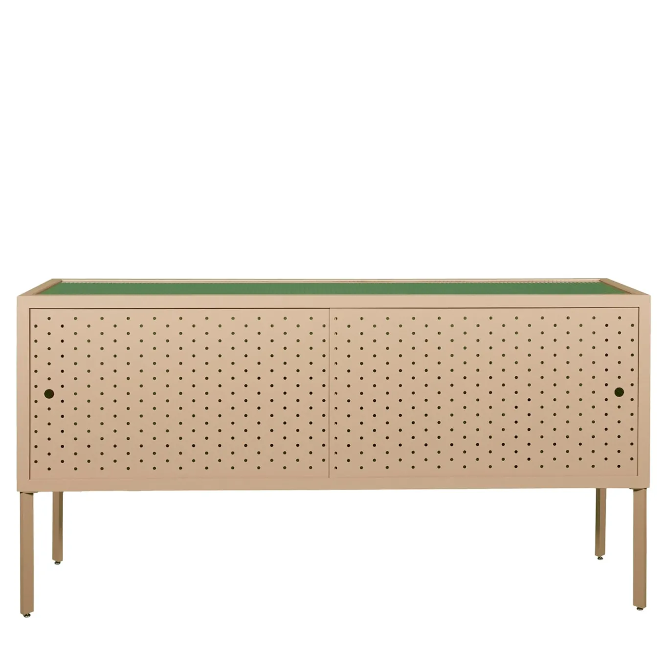 The Maia Sideboard in sand features a minimalist design rooted in rationalist aesthetics, ideal for refined contemporary interiors. Crafted from metal with a warm sand finish, it is distinguished by perforated doors that offer discreet ventilation and subtle visual texture. The top panel is made of transparent polycarbonate, also available in a smoked version, combining practicality with a clean, architectural presence. Designed by Michele Giacopini & MM Company. A gray version is available in the Artemest catalog, with additional color options upon request. Please contact the Concierge for further information.