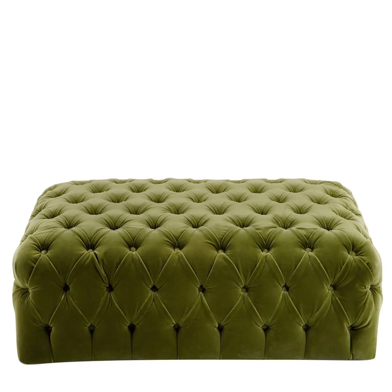 Playing a leading role in the living room, where it becomes a central island to display art books and trays, or in front of a sofa to offer a welcoming seat for guests, this precious pouf is as elegant as it is functional. The plywood and fir frame, padded with multi-density polyurethane, boasts a hunter green Dacron upholstery with an exquisite tufted work. The recessed feet are in PVC.