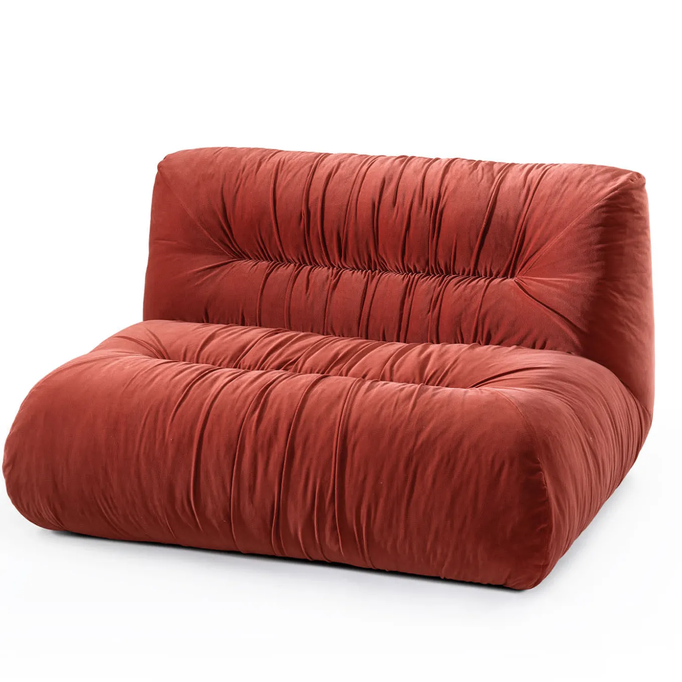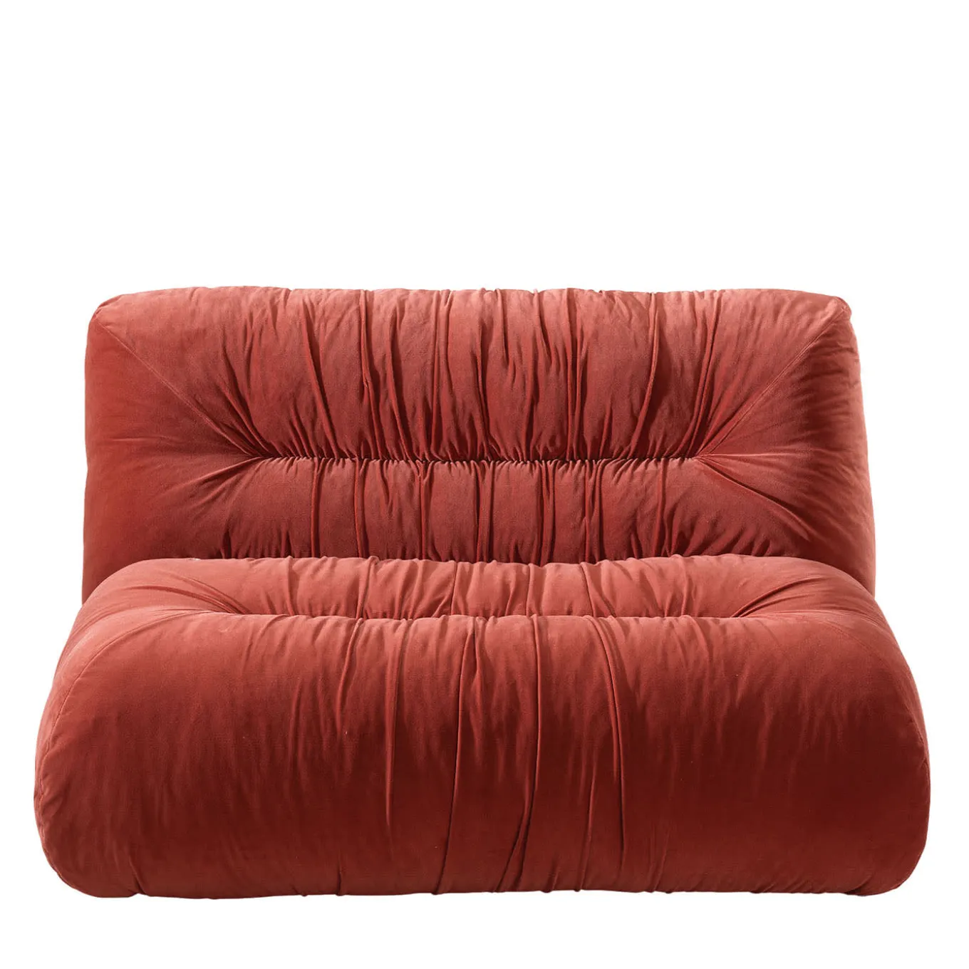 Distinguished by plush volumes inviting one to sink into moments of unrivaled comfort, this lounge chair is part of a modular design celebrating the bubbliness of mambo. The generous extensive padding is enveloped in soft vibrant-orange velvet whose tone evokes luxuriant tropical lands and its wrinkled design is borrowed from Creole dancers’ dressers. A majestic sofa version is available in the Artemest catalog.