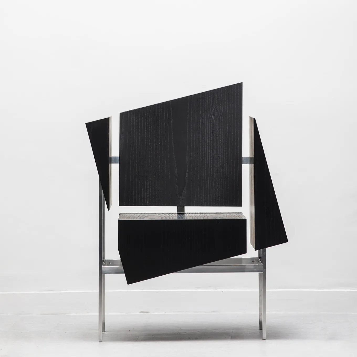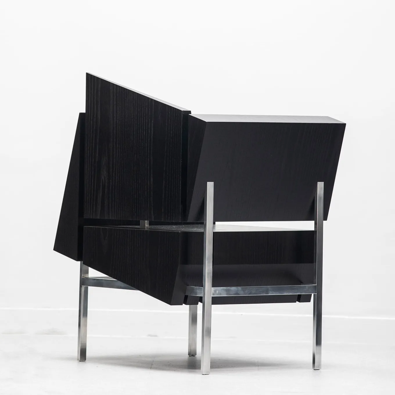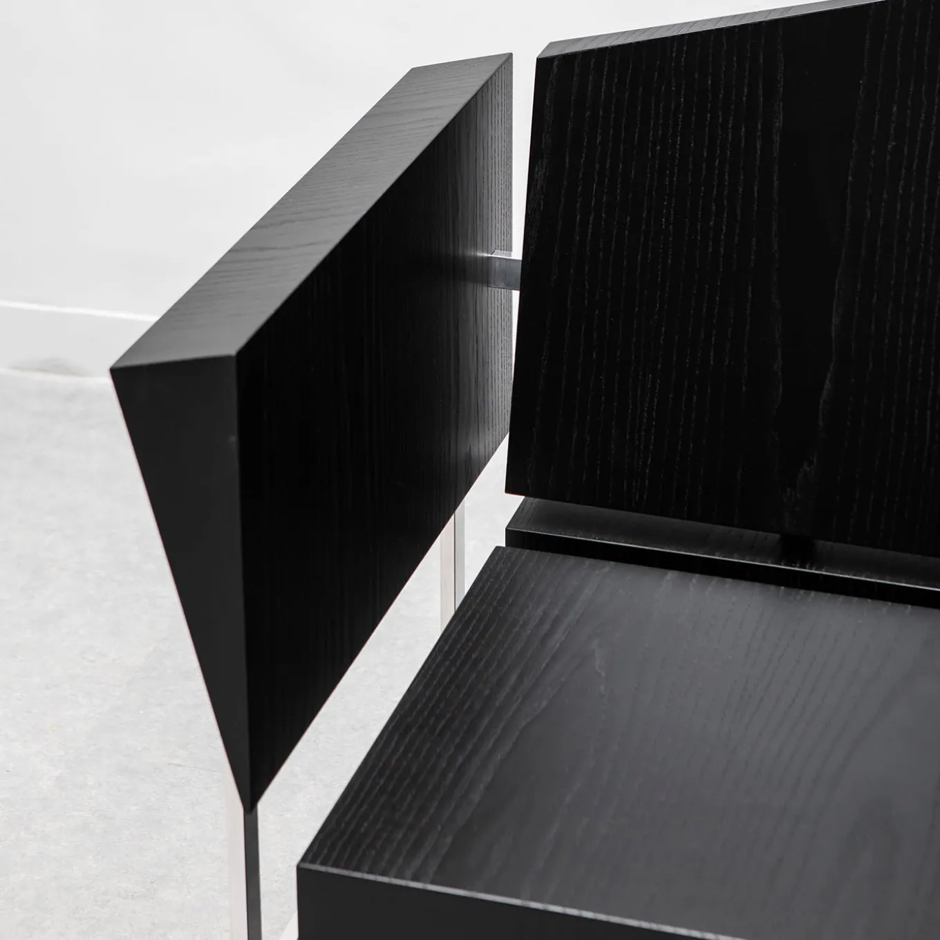 The elegant chair features a polished aluminum frame paired with seat, armrests, and backrest crafted from matte black oak with an open-pore finish. The combination of sleek metal and textured wood creates a sophisticated design, perfect for contemporary interiors seeking a touch of refinement and durability.