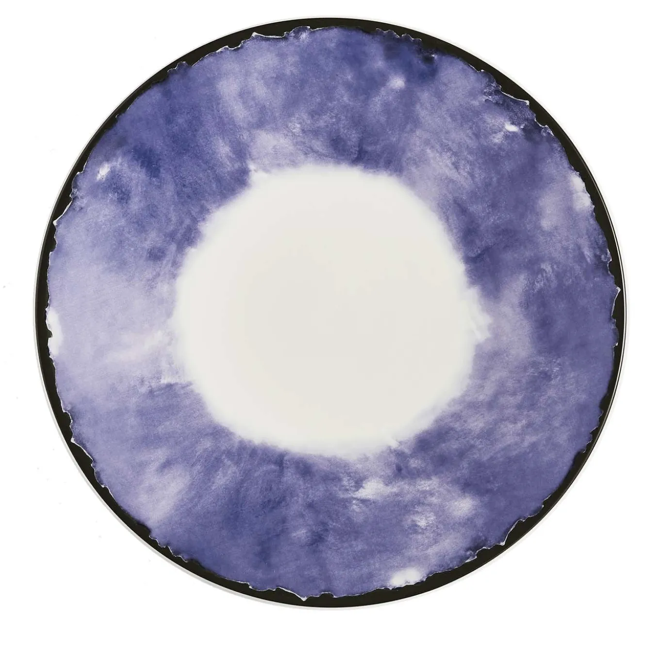 A charming interpretation of a formal table accent, this elegant service plate embodies minimalist sensibility and traditional crafting techniques. Fashioned of white porcelain, the round silhouette is highlighted by a delicate, dark blue edge and a smoky periwinkle gradient along with the interior, the subtle color variations enhancing the playful allure of the piece. Used as a plate on formal occasions or a bold centerpiece for candles and potpourri, this piece is a unique and versatile canvas. Available in other colors upon request, please contact the Concierge. The plate is 31 cm.