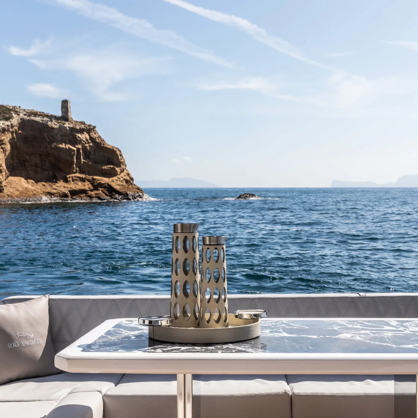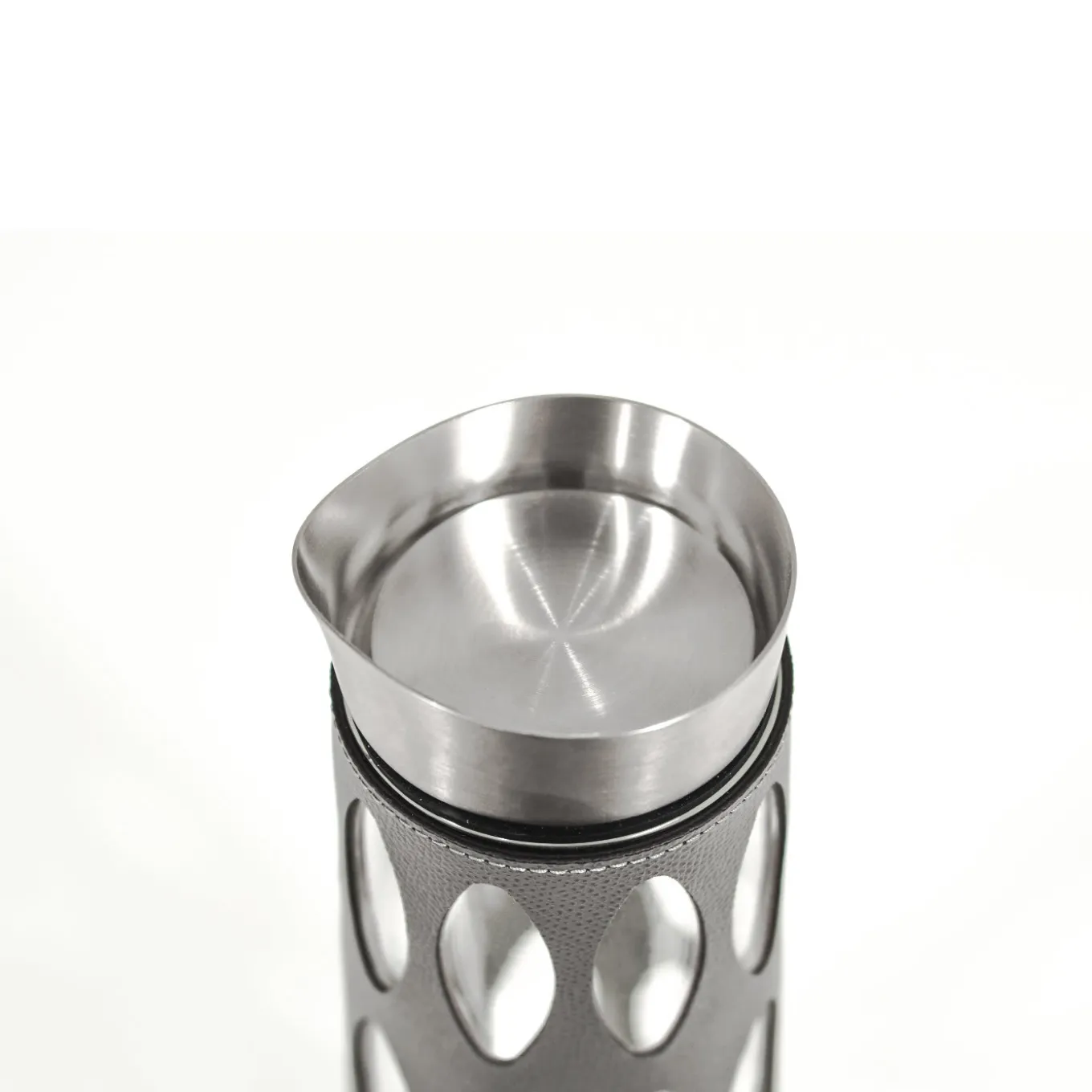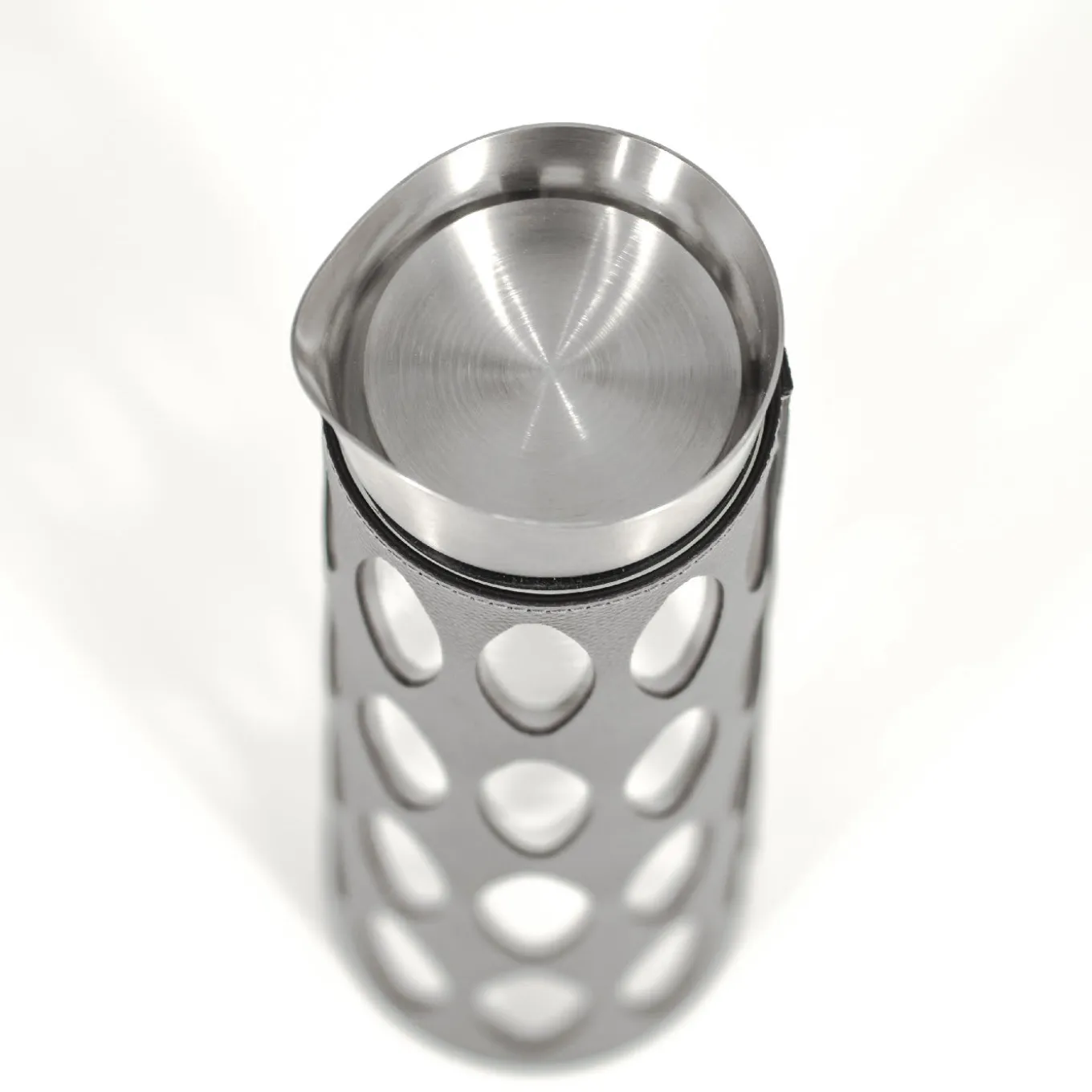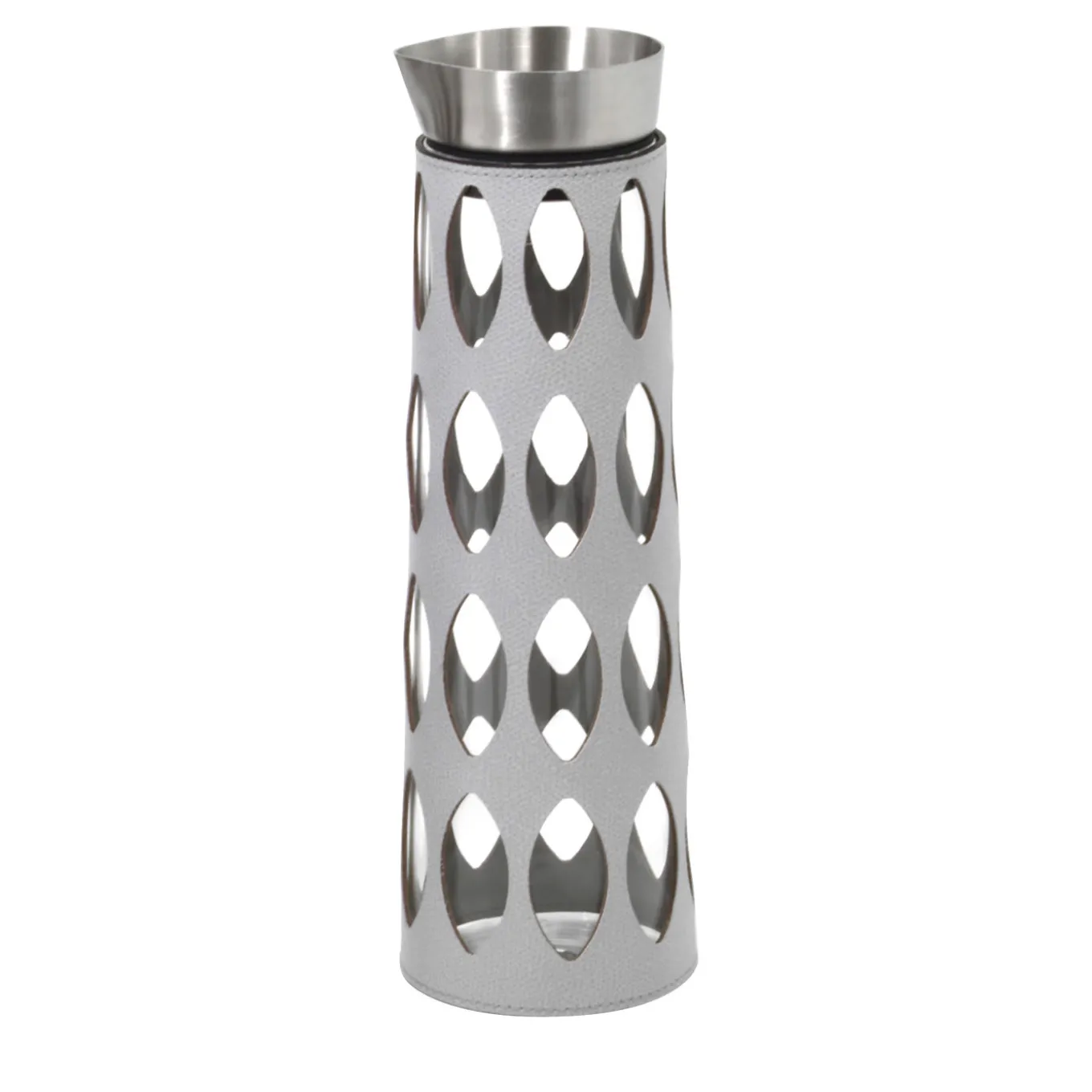 This large cylindrical glass carafe comes covered in a leather cover decorated in laser-cut, diamond-shaped cut-outs spaced evenly around the carafe. This piece can be personalized in two sizes and a variety of colors of leather. Table settings get a touch of sophistication thanks to this piece, which has a metal spout and lip