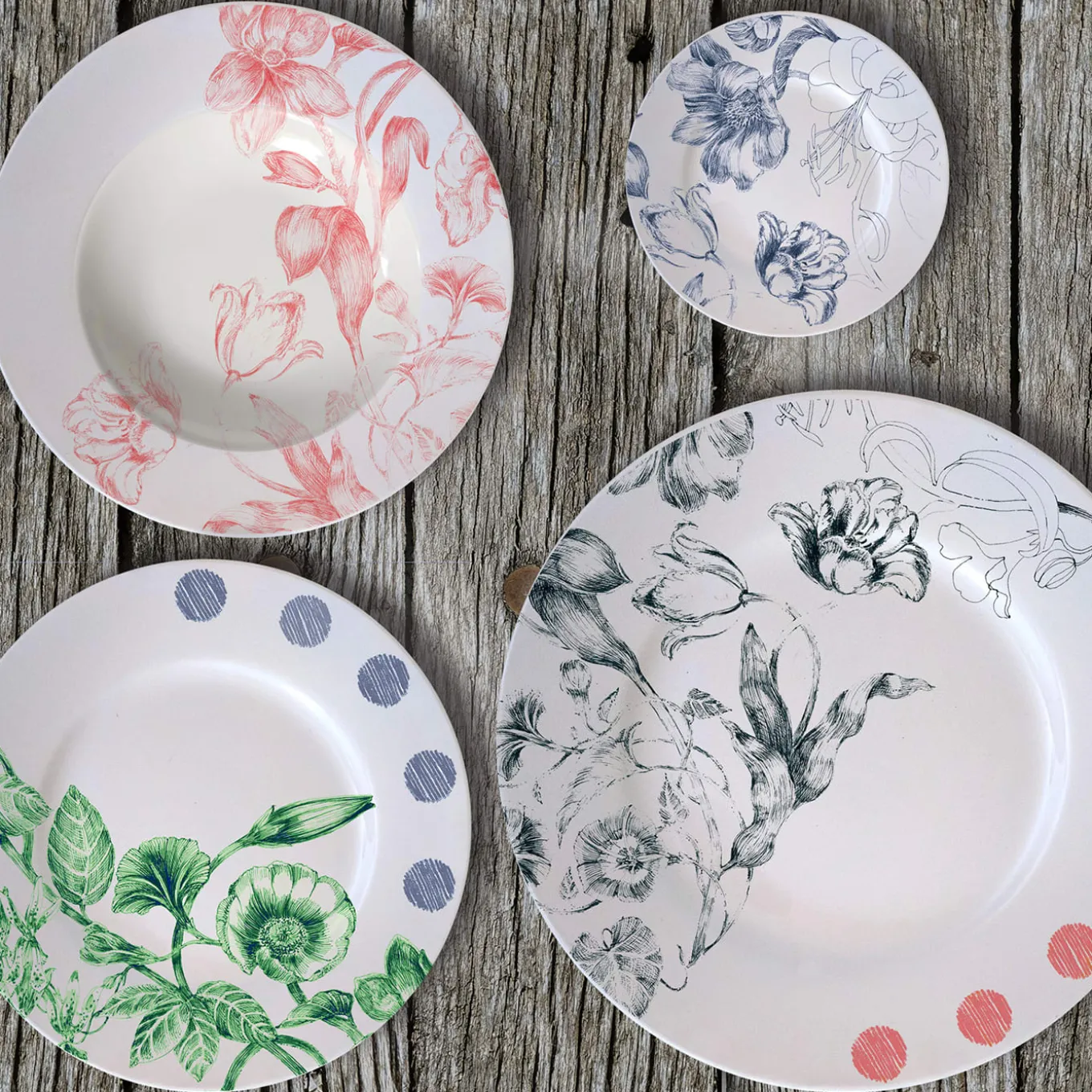 This superb dessert plate is part of the Marie Antoinette Collection of prized porcelain ware. Handcrafted and painted by hand, its sleek white surface is enhanced with a striking yet graceful floral decoration that resembles a pencil-like drawing, making it an exclusive piece of design to display during special gatherings with friends and loved ones.