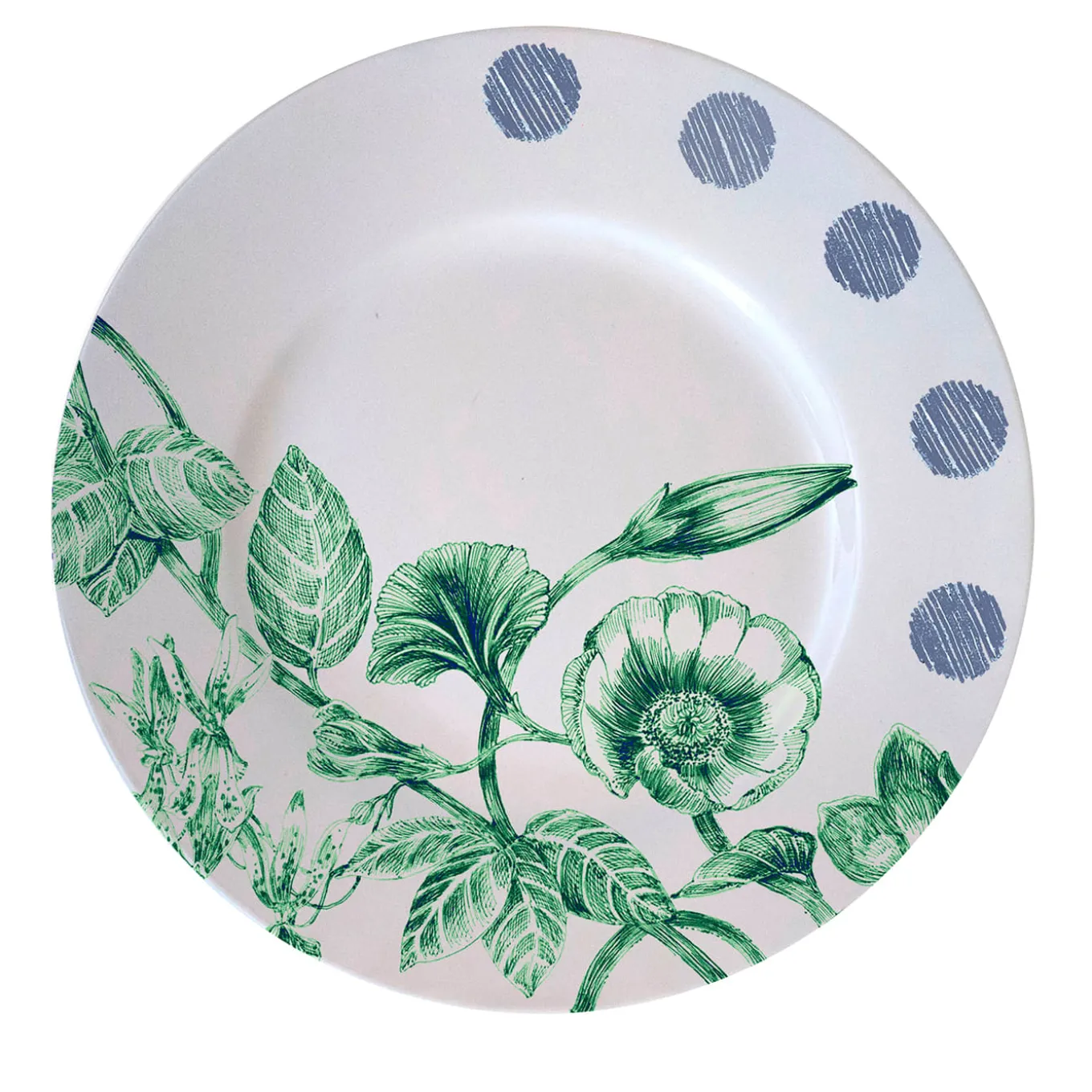 An extraordinary design by Francesca Colombo for the Marie Antoinette Collection, this stunning dessert plate is graced with a delicate and alluring floral decoration rendered in shades of green that juxtapose the round geometric accents in blue along the upper profile. Deftly handcrafted of prized porcelain, it is ideally combined with others from the same series to create assorted compositions of stunning evocative power.