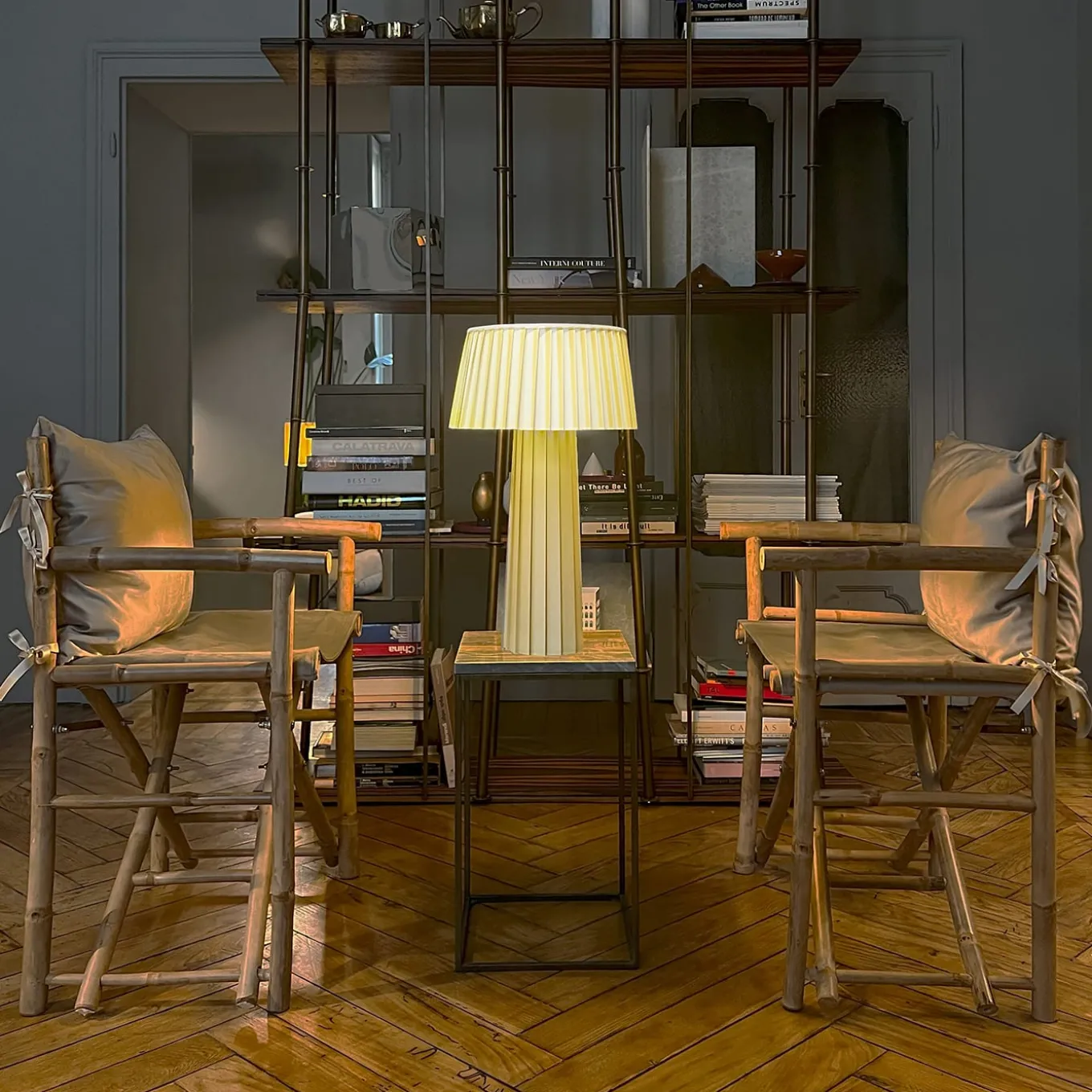 Table lamp made of ivory-colored parchment paper. Lampshade and base have a pleated surface that resembles a fabric, creating a play of light and shadow. The main feature is its lightness: the lampshade is soft at the bottom, like a flowing skirt, while still ensuring the stability of the piece. This delicate yet stable design is why the collection has been named “Flowers.”