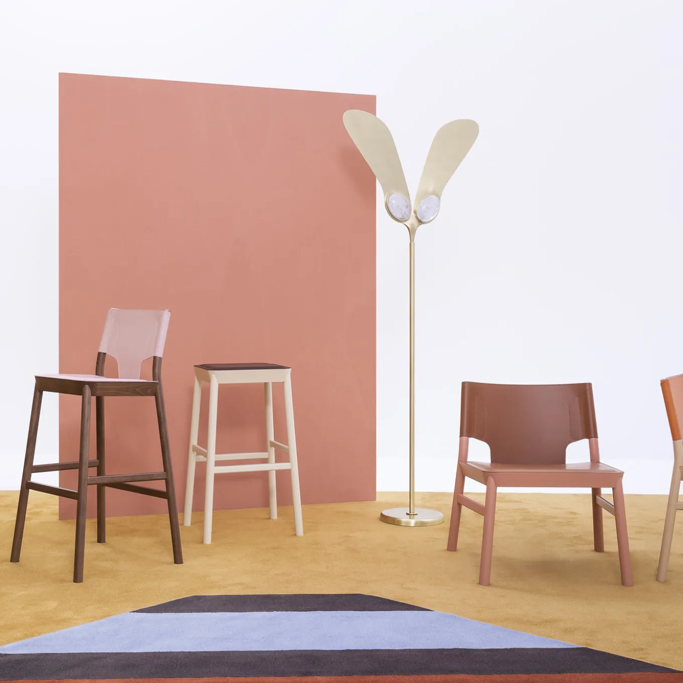 Designed by Emilio Nanni, the Marimba Stool brings together wood and leather in a happy harmony between stability and agility. In walnut-stained solid beechwood, upholstered in pink leatherette, the stool comes complete with a white steel handle to help you move it. A lounge chair and dining chair are also available.