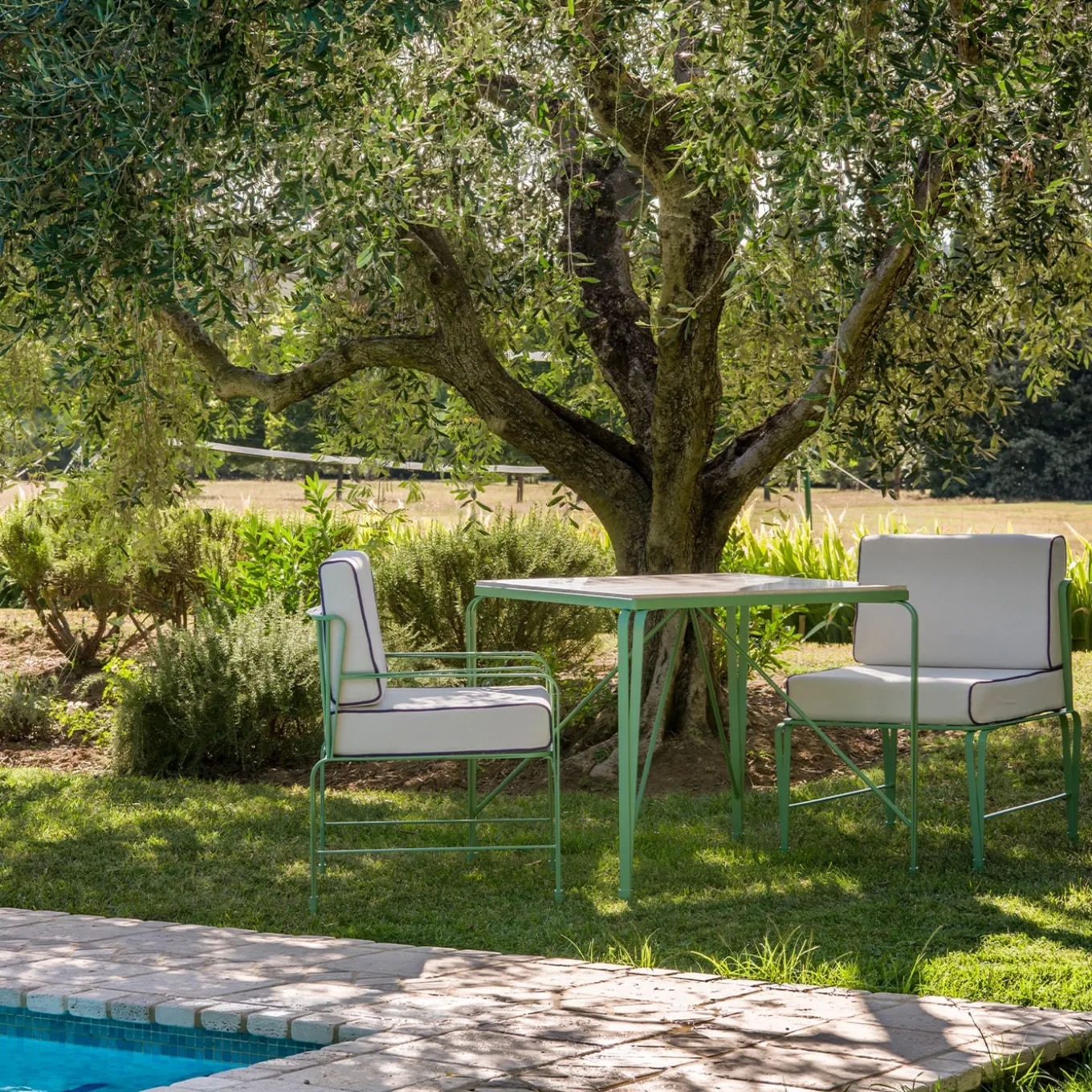 Best paired with the plush chairs and armchairs from the same series for a cohesive and stylish statement, this square table is fashioned employing blacksmithing methods from the Florentine tradition. The slender, thin elements making up the frame in forged, zinc-coated, and powder-varnished iron trace a tapered profile for the legs and a minimalist profile for the Travertine top. A round variant is also available upon request to the Concierge.