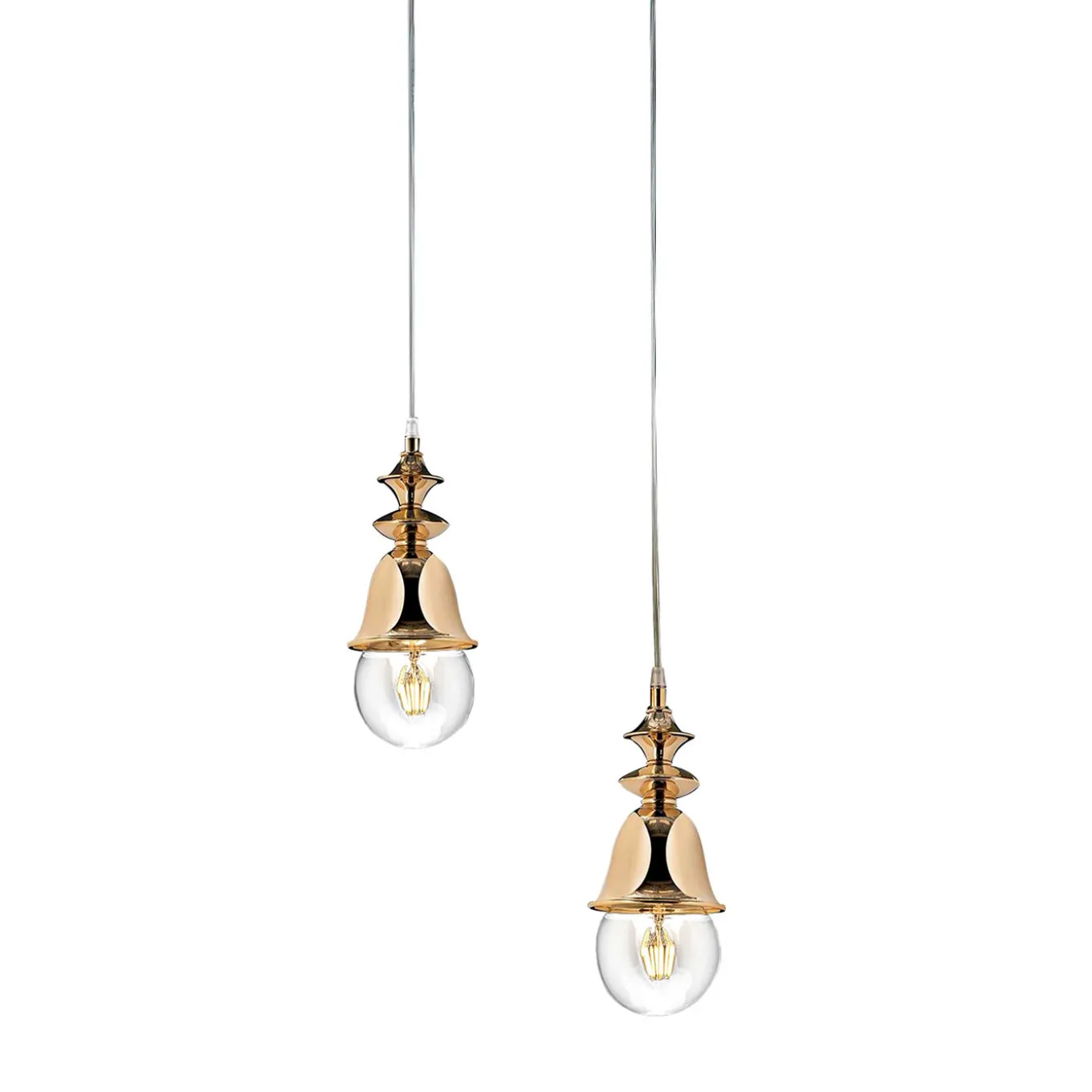 Delicately suspended from a slim wire, this pendant lamp will infuse a room with modern sophistication. Boasting simple, elegant lines, its bell-shaped lampshade is the standout feature of the piece. Made of brass and metal, it is finished with a polished-gold hue and is also available in other finishes, please consult the Concierge for options.