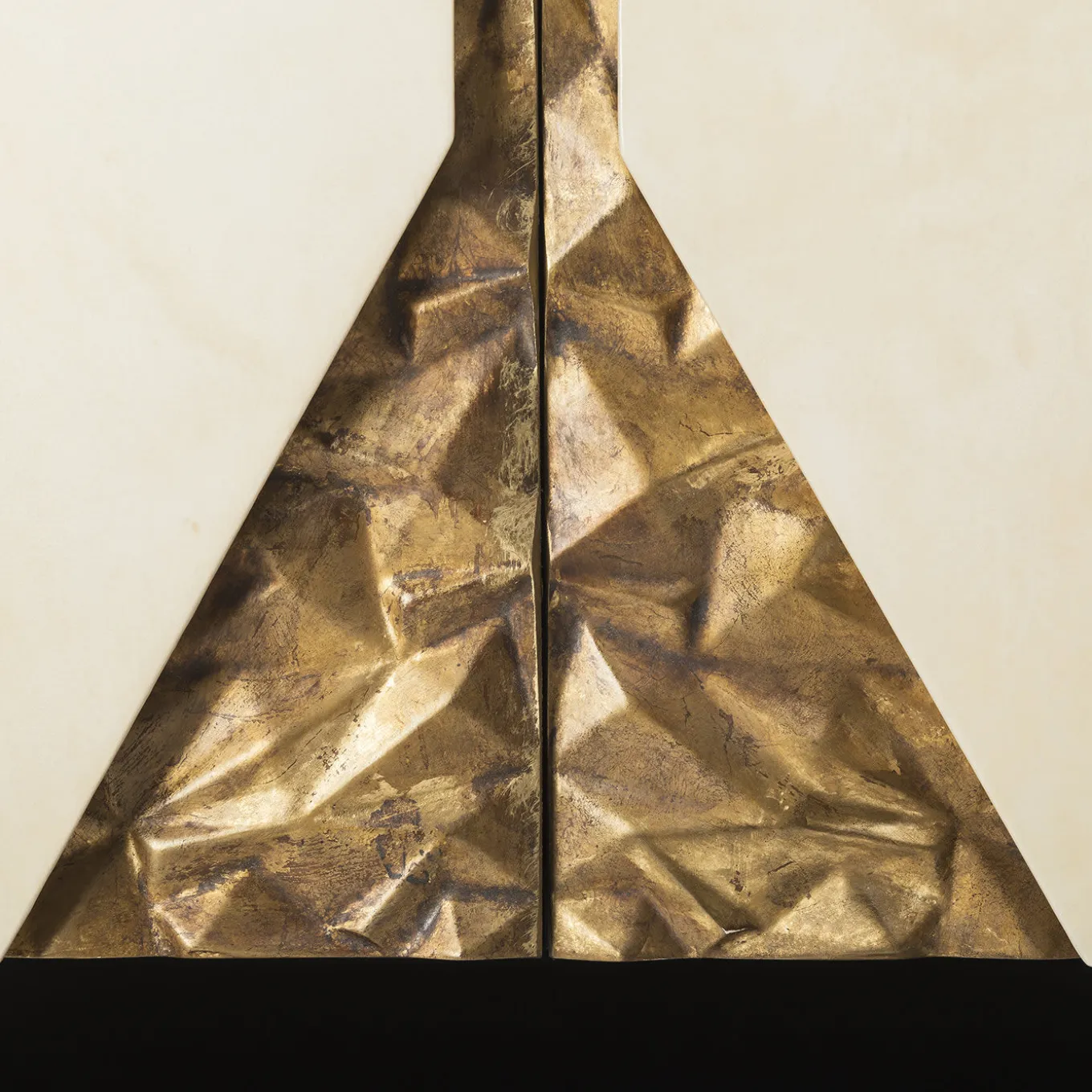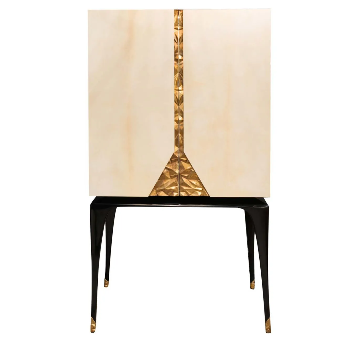 Stunning and brimming with style, the Martini Bar Cabinet in Macassar ebony features glossy streaks in shaded orange, legs in black lacquered wood, doors in antique-looking polished ivory-colored parchment and detail in gold leaf, etched by hand. The interior incorporates a mirror led light backdrop and is equipped with drawers and removable trays.