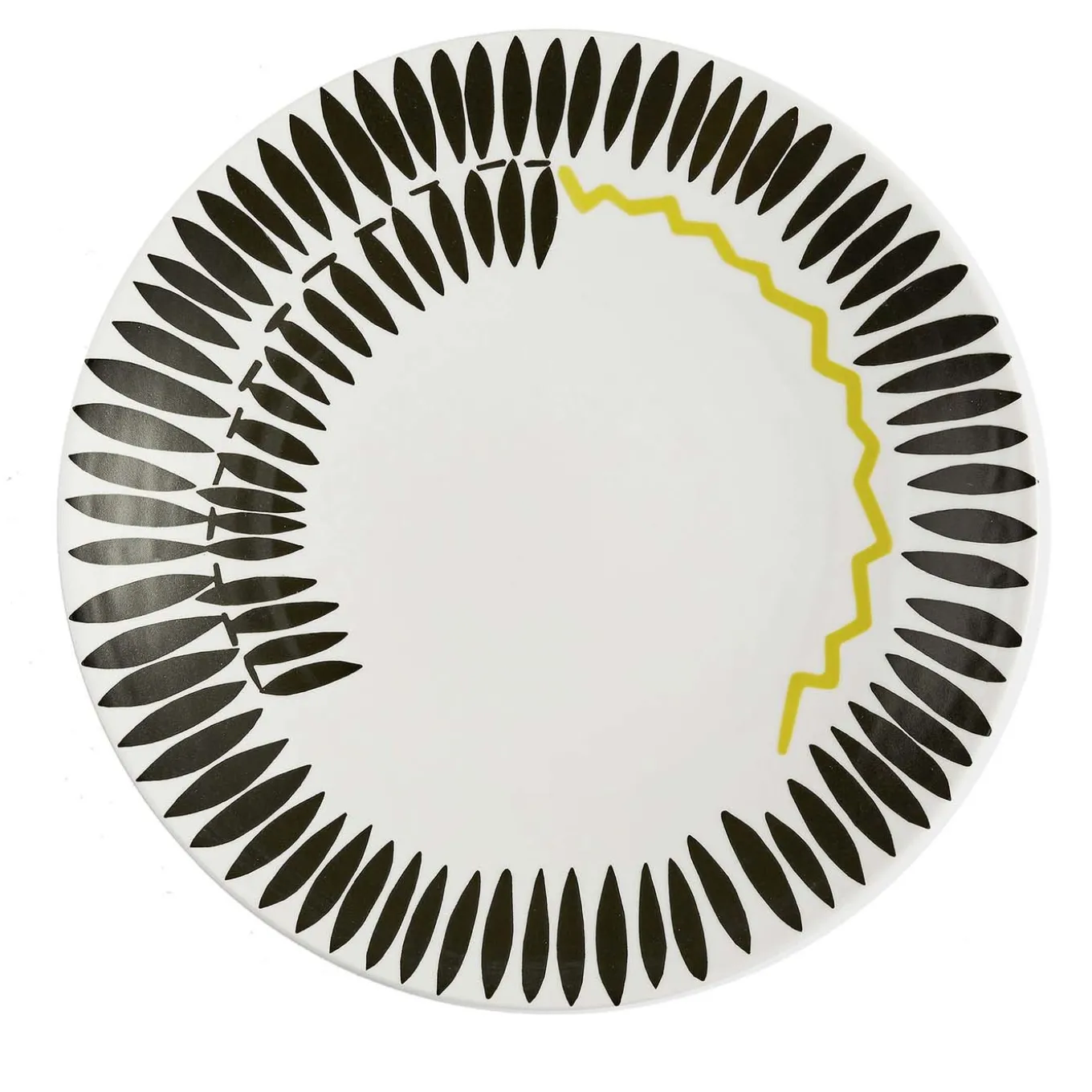 Bold and versatile, this lavish porcelain plate is an exceptional showcase of innovative minimalist design and traditional crafting methods. An abstract concentric pattern characterizes the wide silhouette, as the outer rim features navette-shaped accents in black that frame a smaller, partial ring of navettes and a second partial ring of a yellow zigzag line along the inside. The combination of geometric shapes and colors creates a dynamic visual contrast that heightens the allure and sophistication of the piece. Best paired with other pieces from the Maschile series. Size: 31 cm.