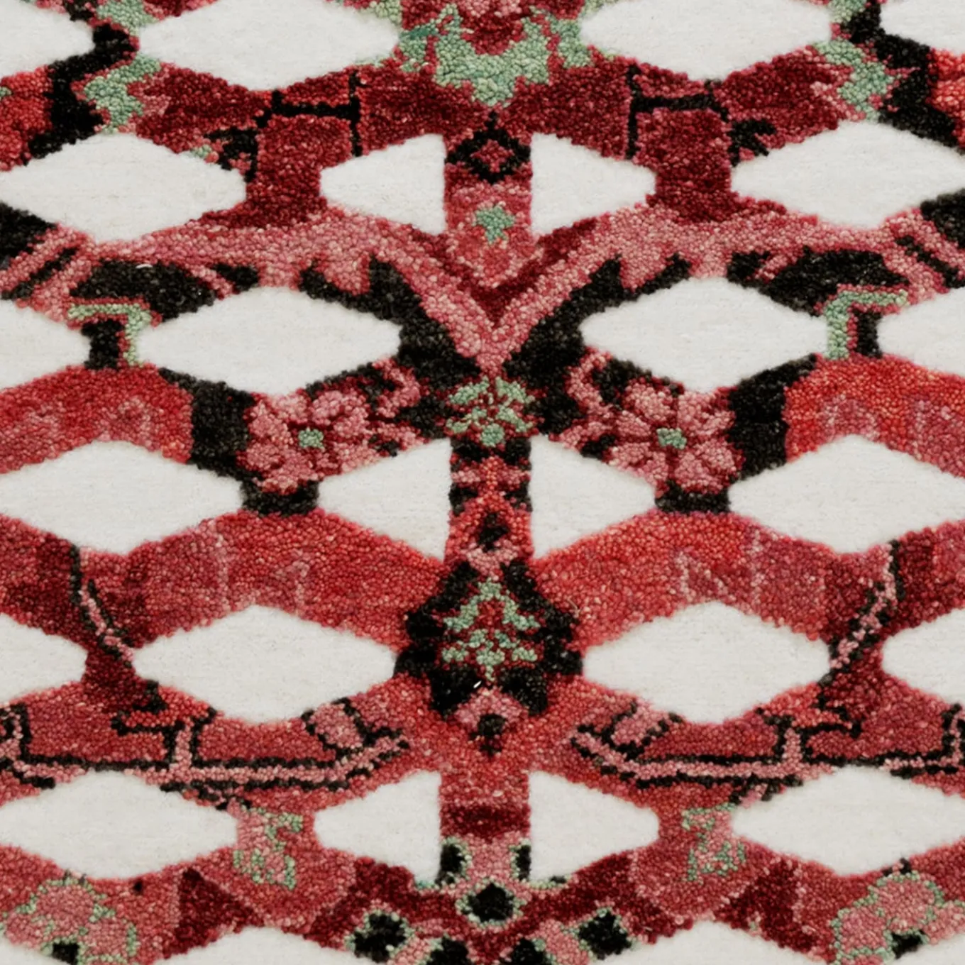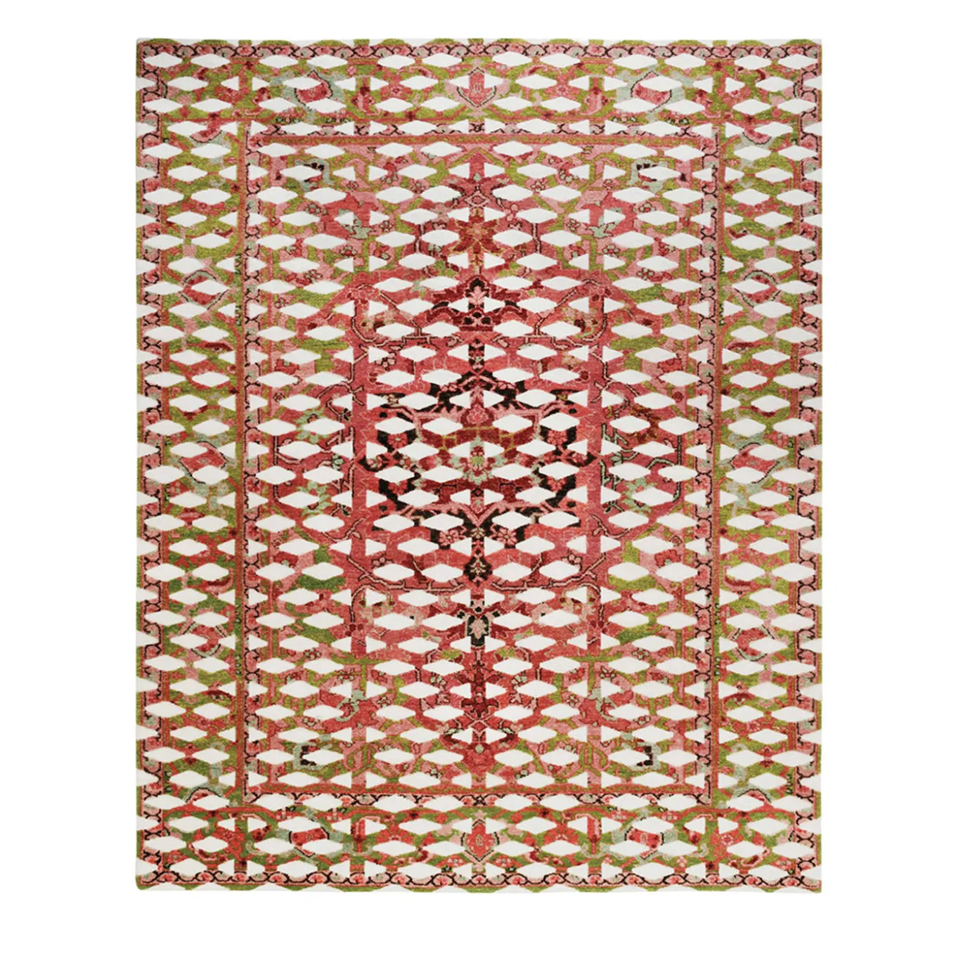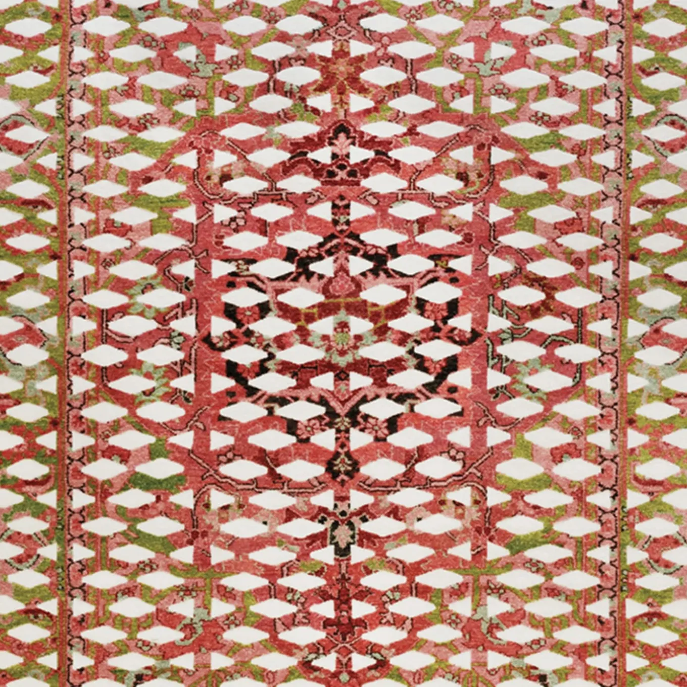 This is the superimposition of a familiar graphic design – used in industrial applications like metal sheeting and panels – with a colorful Oriental rug. Two different cultures far apart in time and space illustrate how a traditional ethnic repertory can be integrated into contemporary visual language. Sophisticated manufacturing intensifies the effect.