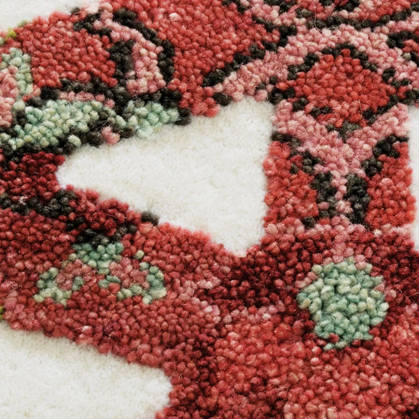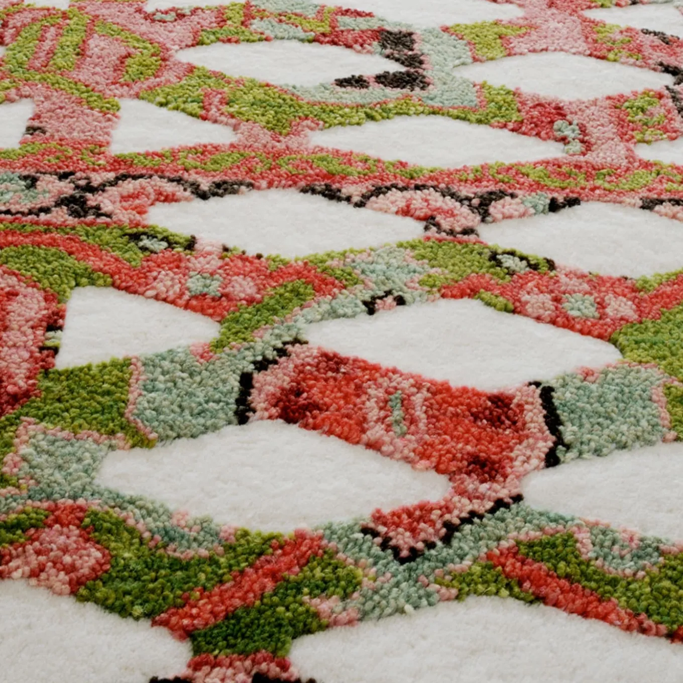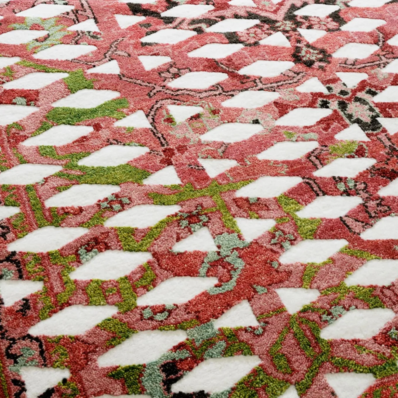 This is the superimposition of a familiar graphic design – used in industrial applications like metal sheeting and panels – with a colorful Oriental rug. Two different cultures far apart in time and space illustrate how a traditional ethnic repertory can be integrated into contemporary visual language. Sophisticated manufacturing intensifies the effect.