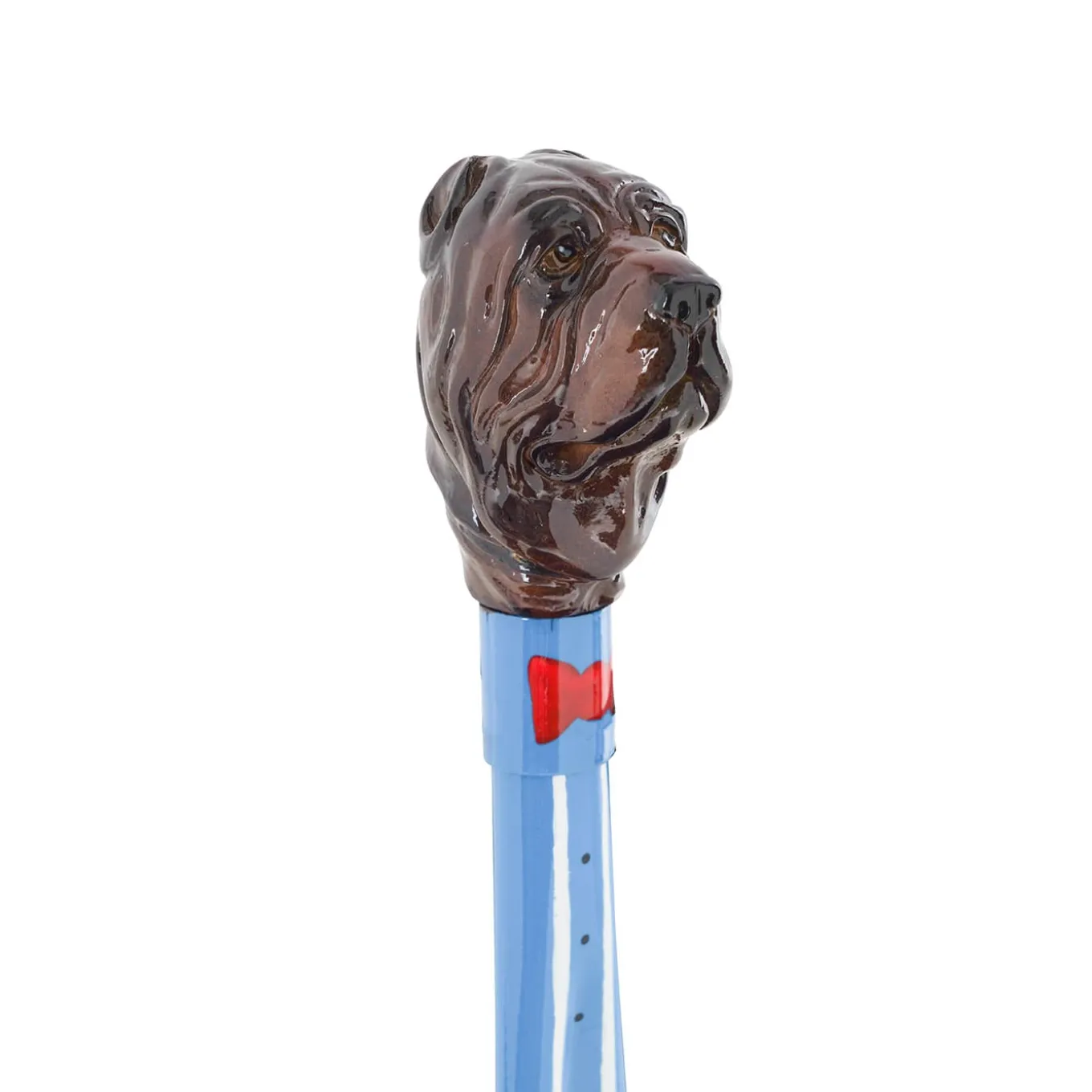 This stylish shoehorn brimms with the fierce character of a mastiff, here reinterpreted in a playful version where the ABS paddle is minutely hand-decorated to resemble a black and azure suit completed by a red bow tie painted on the brass ring. The zoomorphic handle in marble powder is rendered in exquisite detail for a captivating realistic look. The design comes in a refined box.