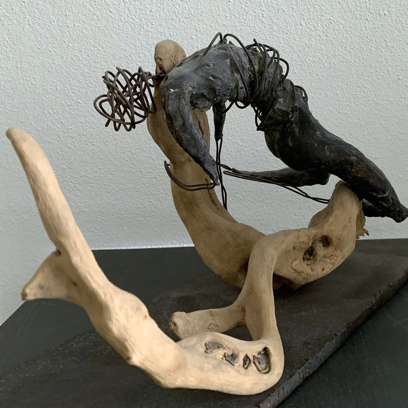A magnificent piece of refined allure, this sculpture merges feelings of solitude, freedom, and peace in a female resting body. Exquisitely crafted of bronze using the ancient method of lost wax, the lying figure is wrapped up with copper wire around her waist, hands, and head, enhancing significant parts of the body. The figure is leaning on a piece of wood, that was picked up on a Tuscan beach after a coastal storm, firmly mounted on a thin iron base.