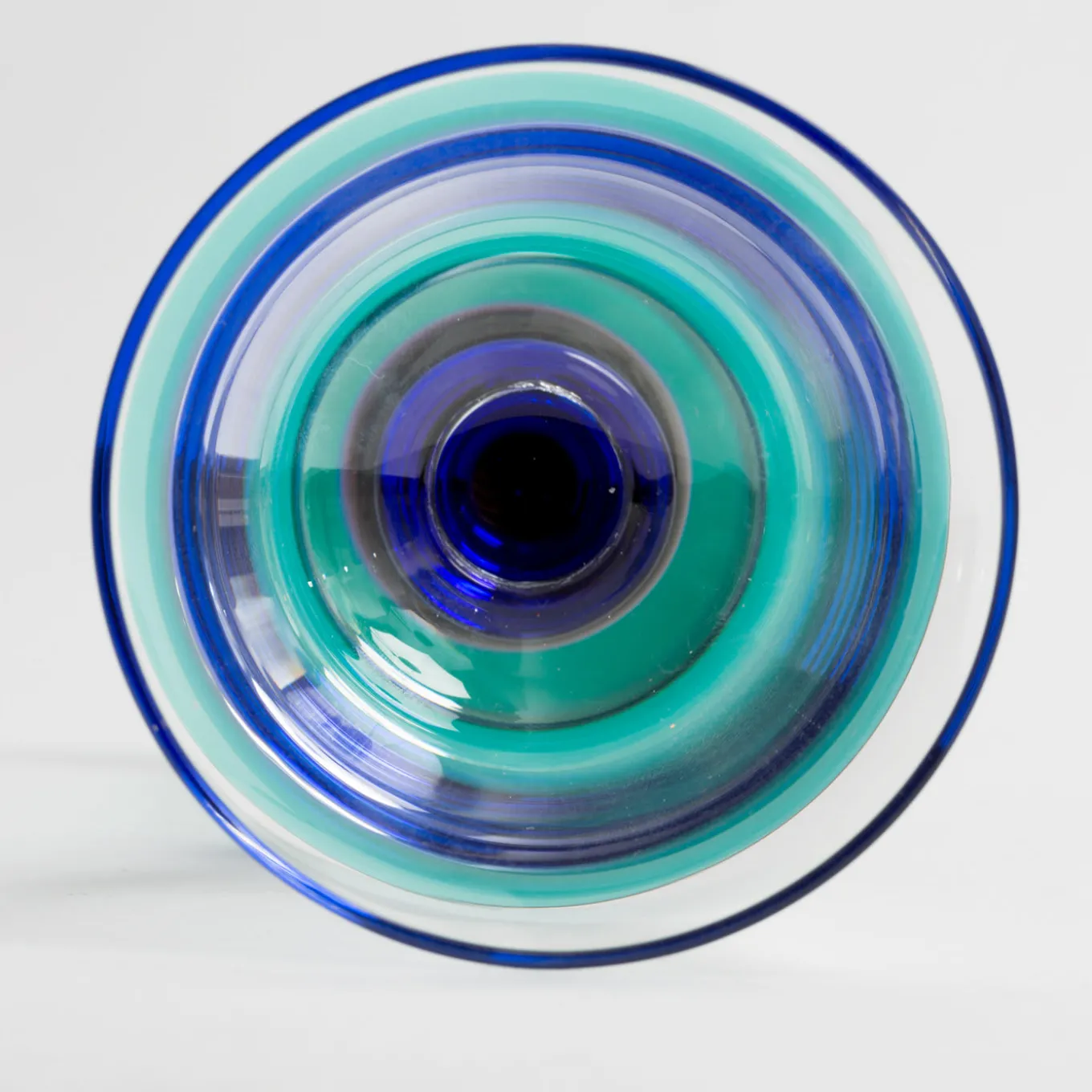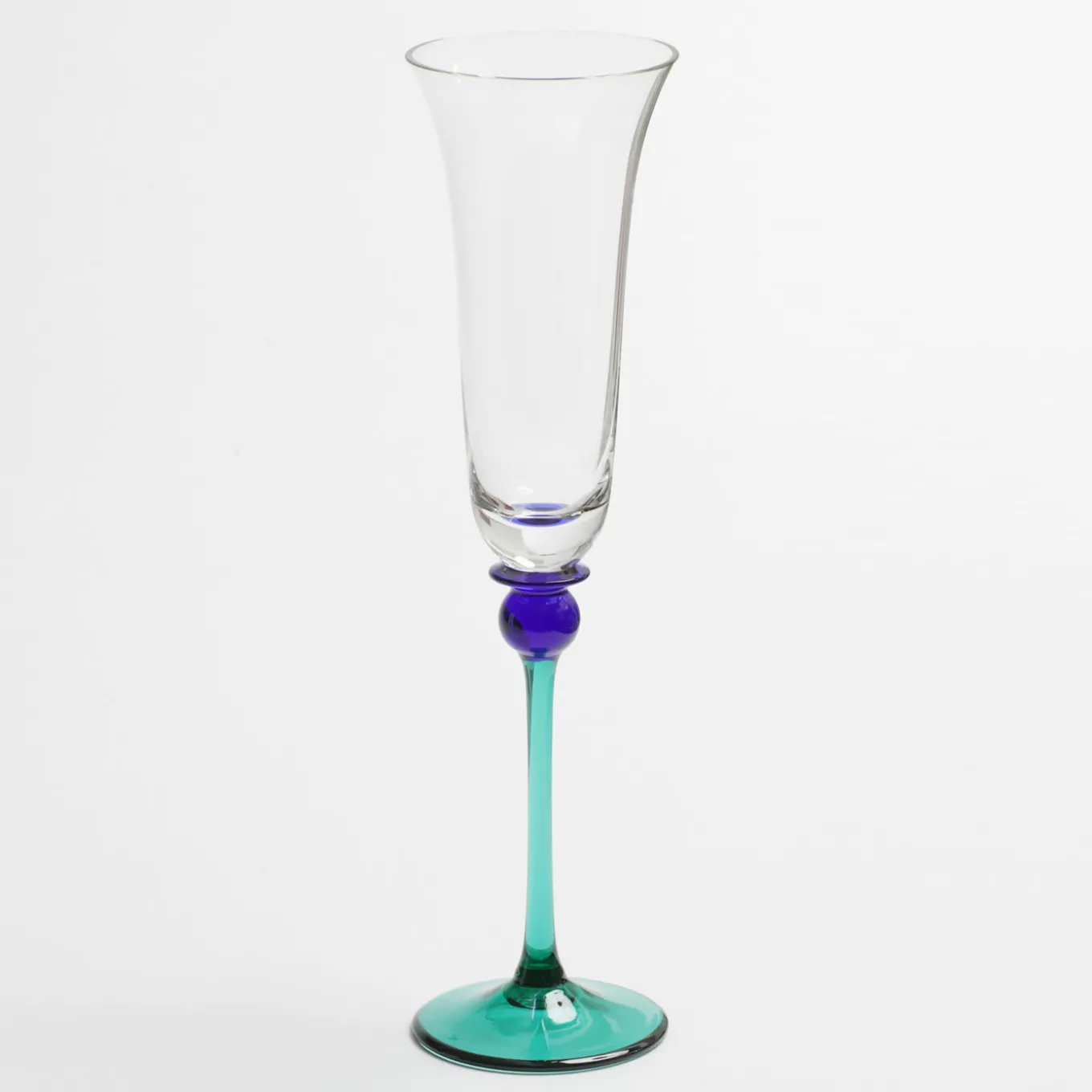 This fine set of three glasses for two is composed of two wine glasses (Ø 7 cm, H 20.5 cm), two water glasses (Ø 8.5 cm, H 23 cm) and two flutes (Ø 6.5 cm, H 25 cm), and features elegant lines and vivid colors. Each glass has a green base that turns blue at its top. The body of the glasses are in a crystal color.