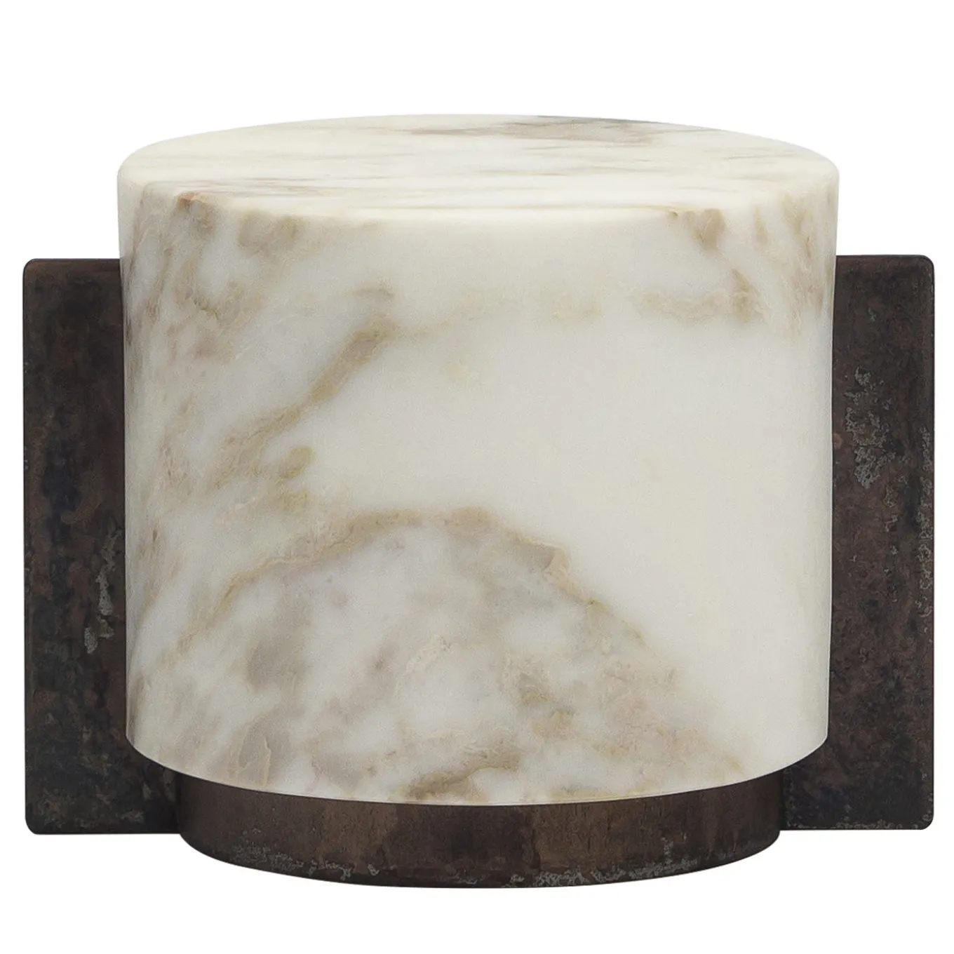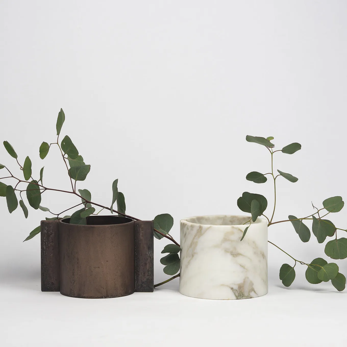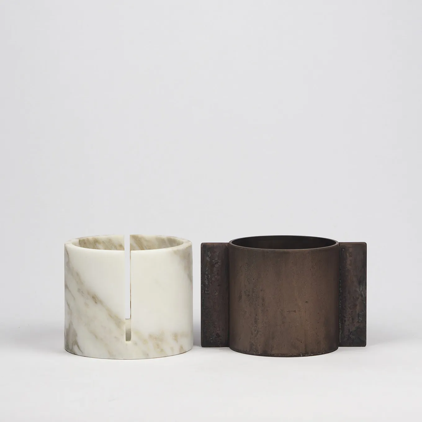 Characterized by the interlocking of quality elements in Calacatta Oro marble and Jerissa stone and in natural metal and Corten, this collection of unique containers represents the boundary between inside and outside, closed and open, private and public. This version measures 14 x 14 x 14 cm and offers an original option for storing small precious items.