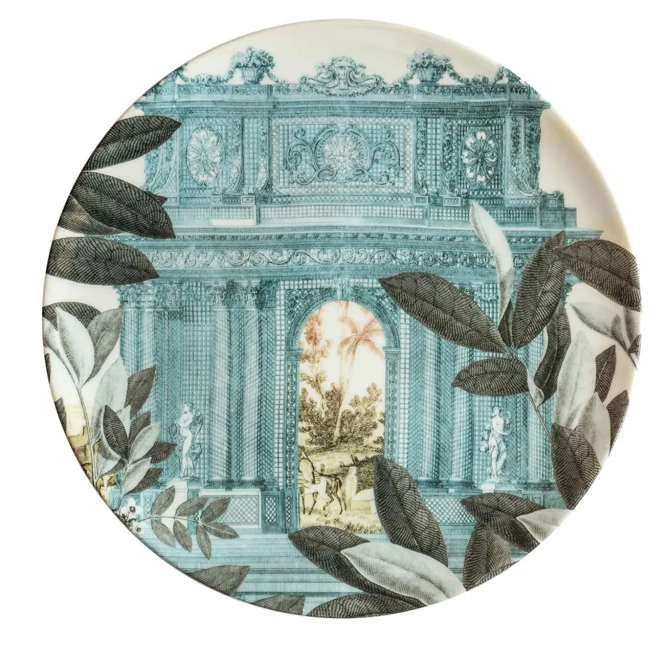 Exuding timeless sophistication, this porcelain plate from the Mediterraneo Collection merges fantasy with reality in a mesmerizing hand-painted decoration of an imposing, occidental gate rendered in blue hues, illuminated by the delicate sunset colors and surrounded by the flora typical of Northern Africa.