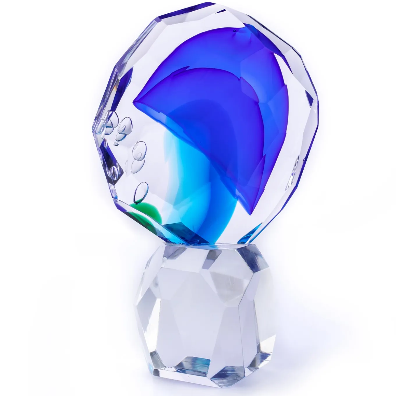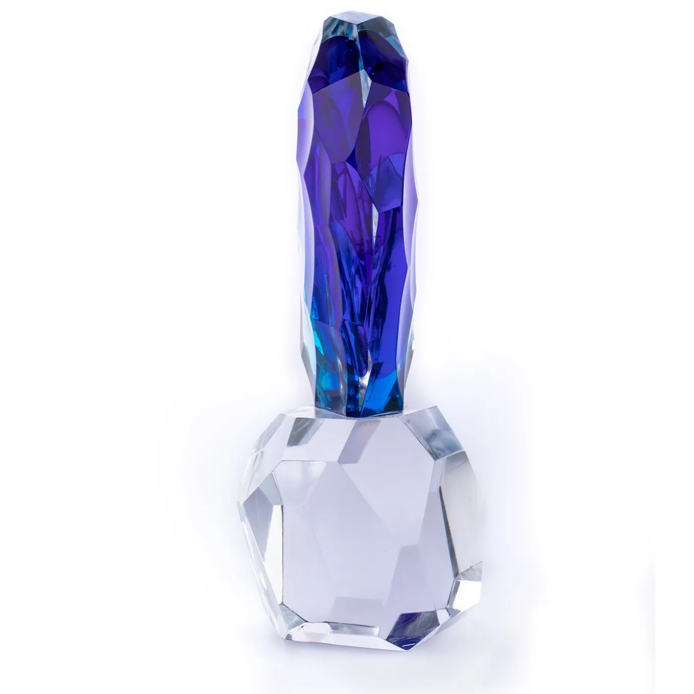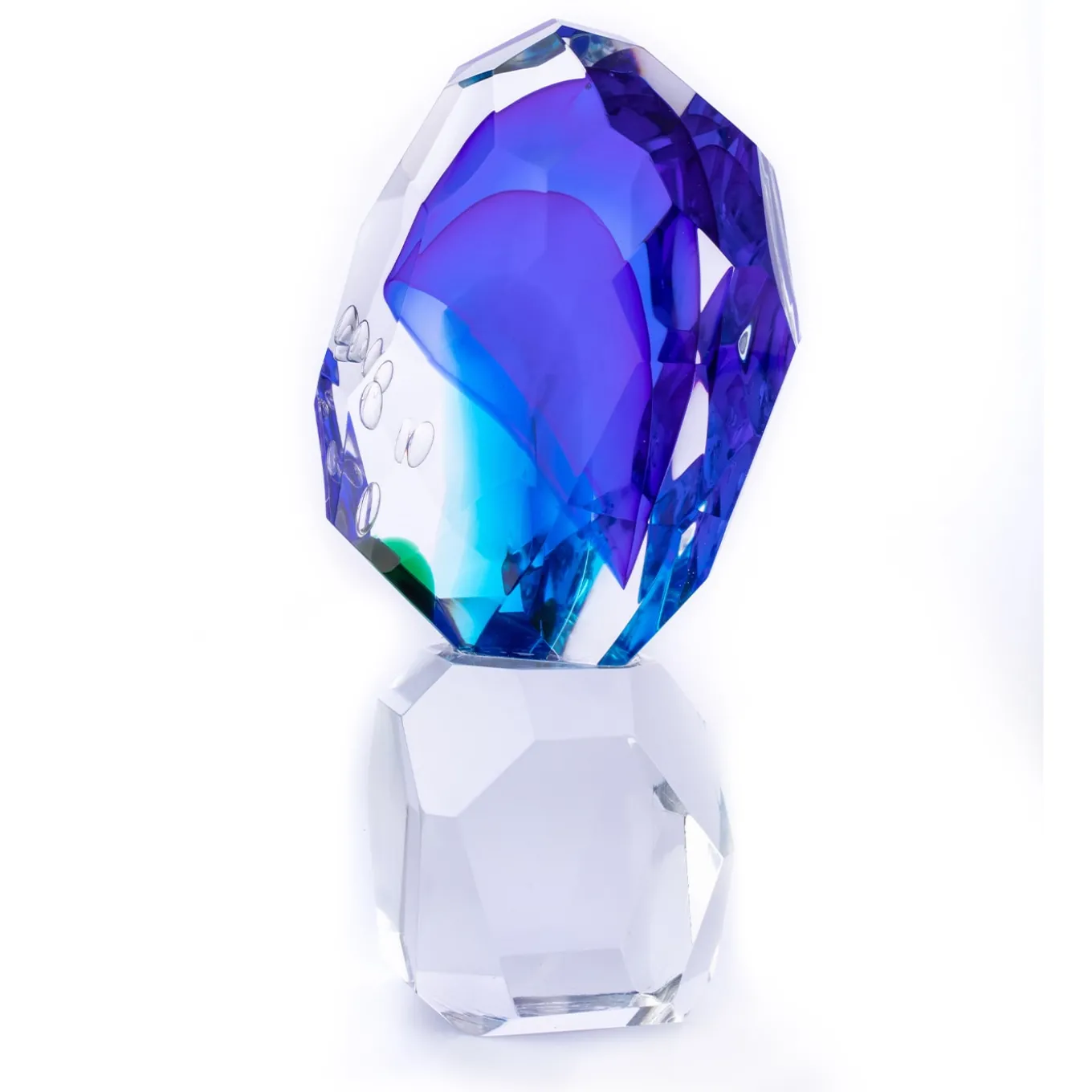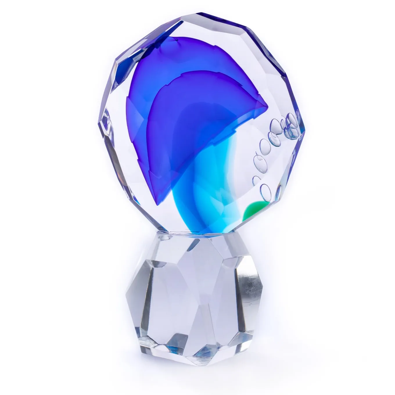 Painstakingly crafted by the expert hands of Venetian master glassmakers, this sculpture in Murano glass is distinguished by a bold yet ethereal silhouette comprised of two piled, rock-like volumes. The larger one incorporates a vibrant, blue-toned element reminiscent of a jellyfish (“medusa” in Italian), an effect achieved by combining deft blowing steps using the traditional “sommerso” technique.