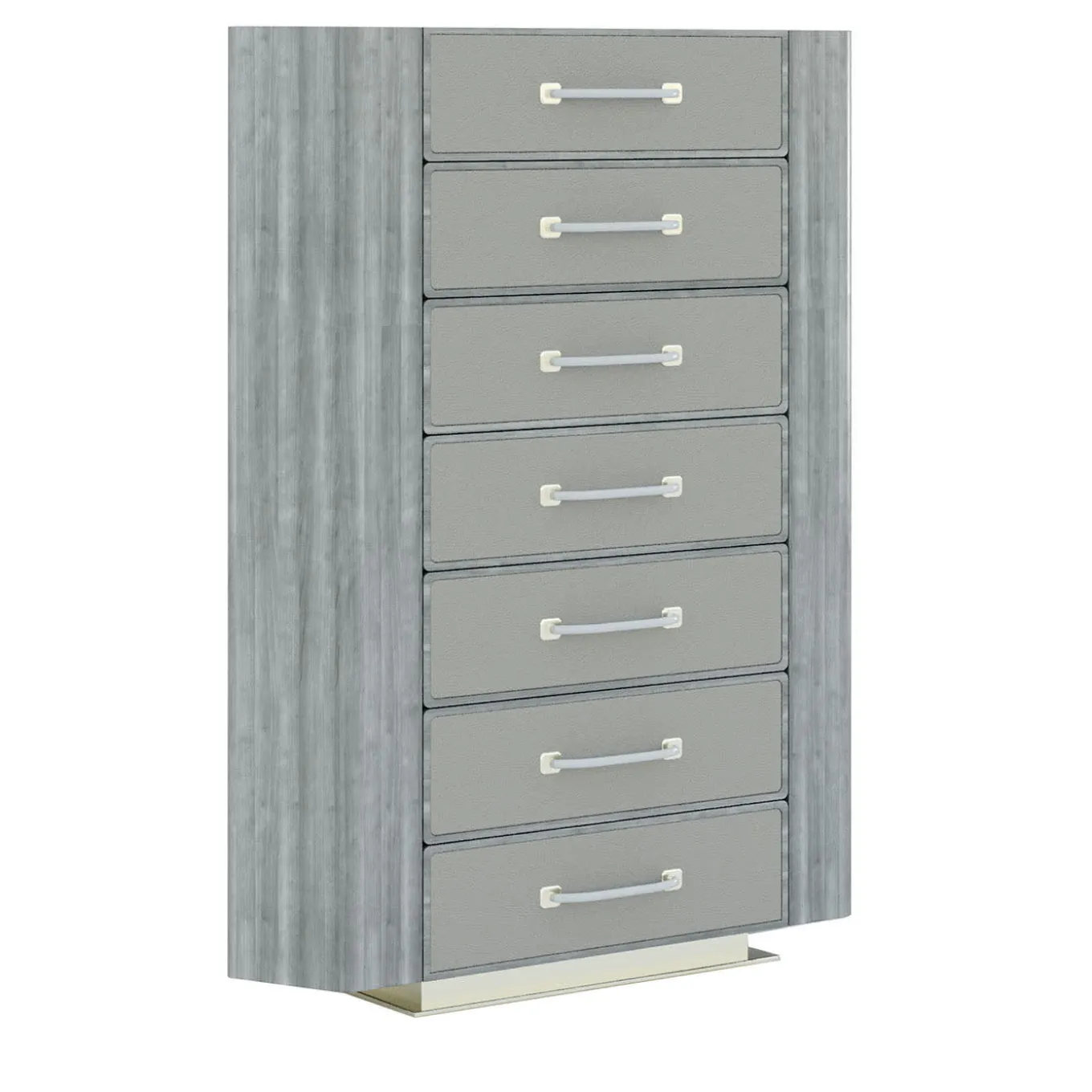 Brimming with luxury, this tall cabinet from the Mellifera Collection is distinguished by meticulous craftsmanship and deft combination of materials. The Eucalyptus wood frame is lacquered in a delicate gray hue that elevates the gray leather upholstery of the drawer fronts and handles. The metal base completes the piece. Please contact the concierge for further details and care instructions.
