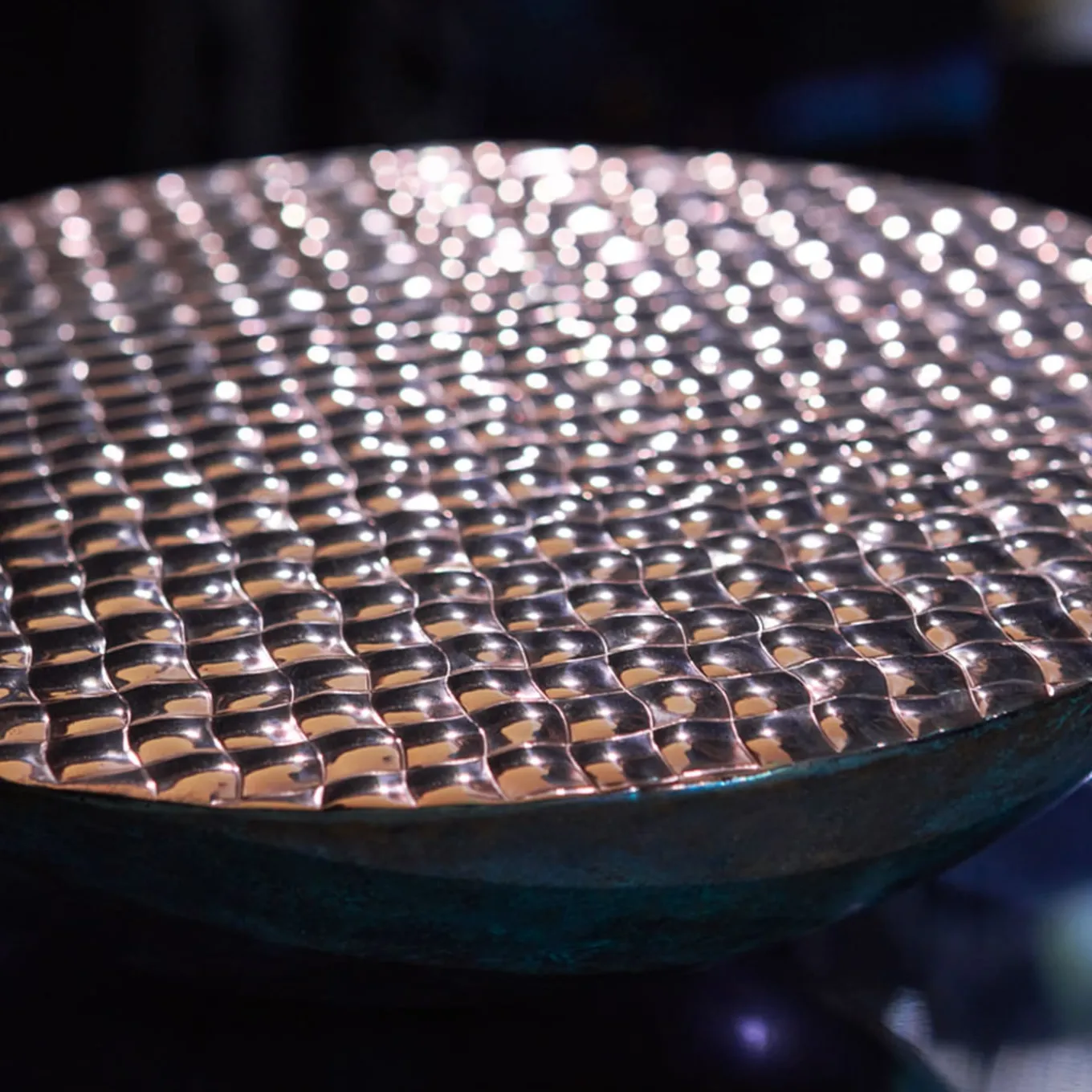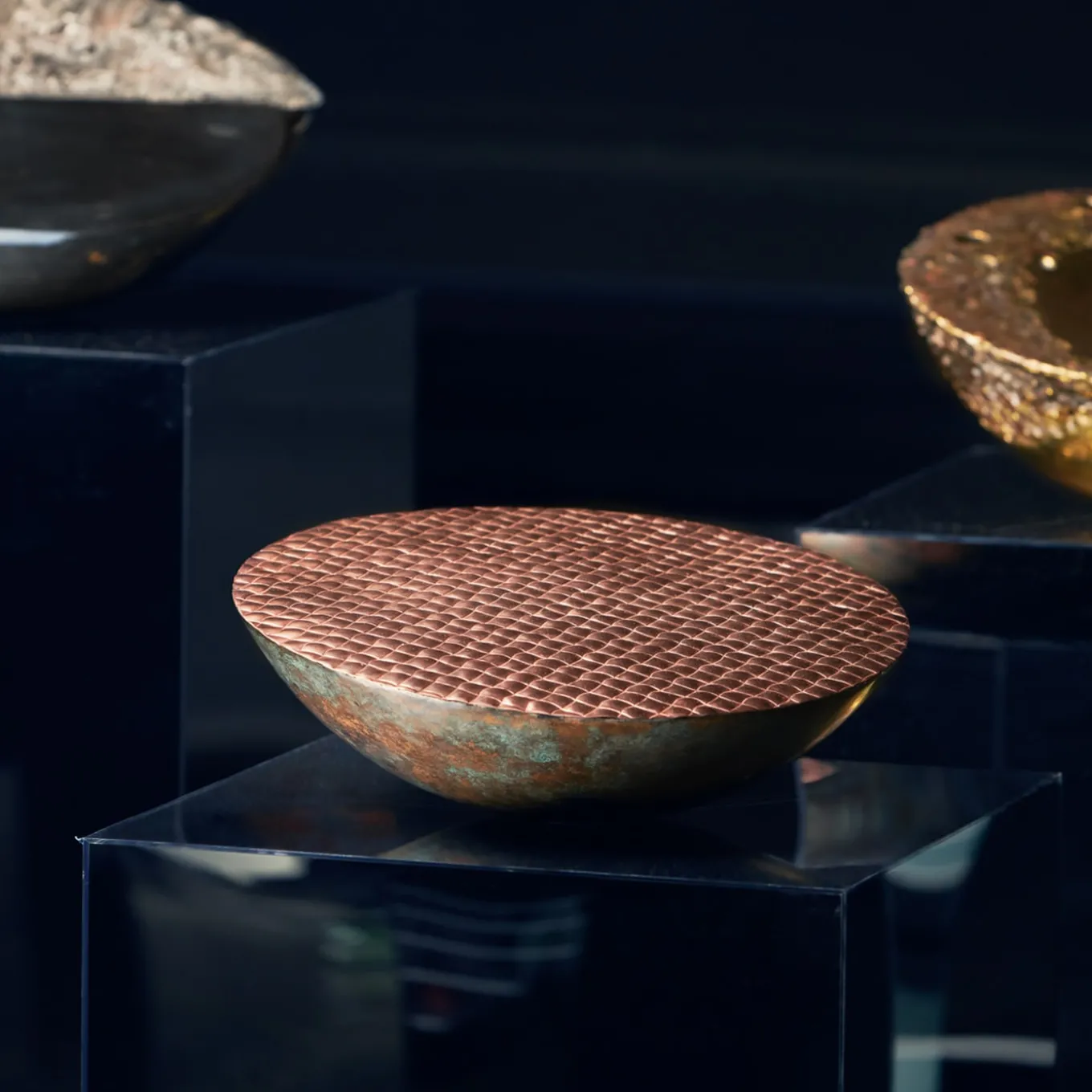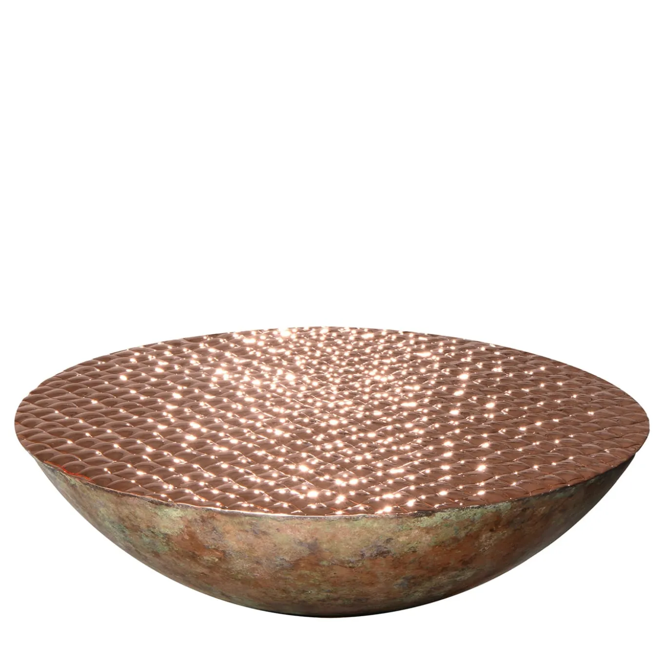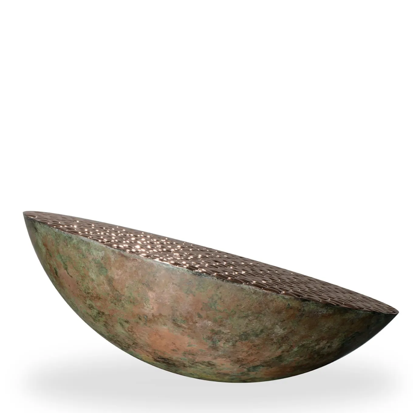 Pure metal revealed in its seductive decorative potential defines the intriguing design of this semispherical sculpture, a unique piece part of a limited series of nine signed, numbered, and certified pieces. Fashioned of copper, this sculpture is defined by the interplay between the raw exterior and the glistening, smooth top which is finely chiseled to resemble convergent and divergent waves rippling on the sea kissed by sunset.