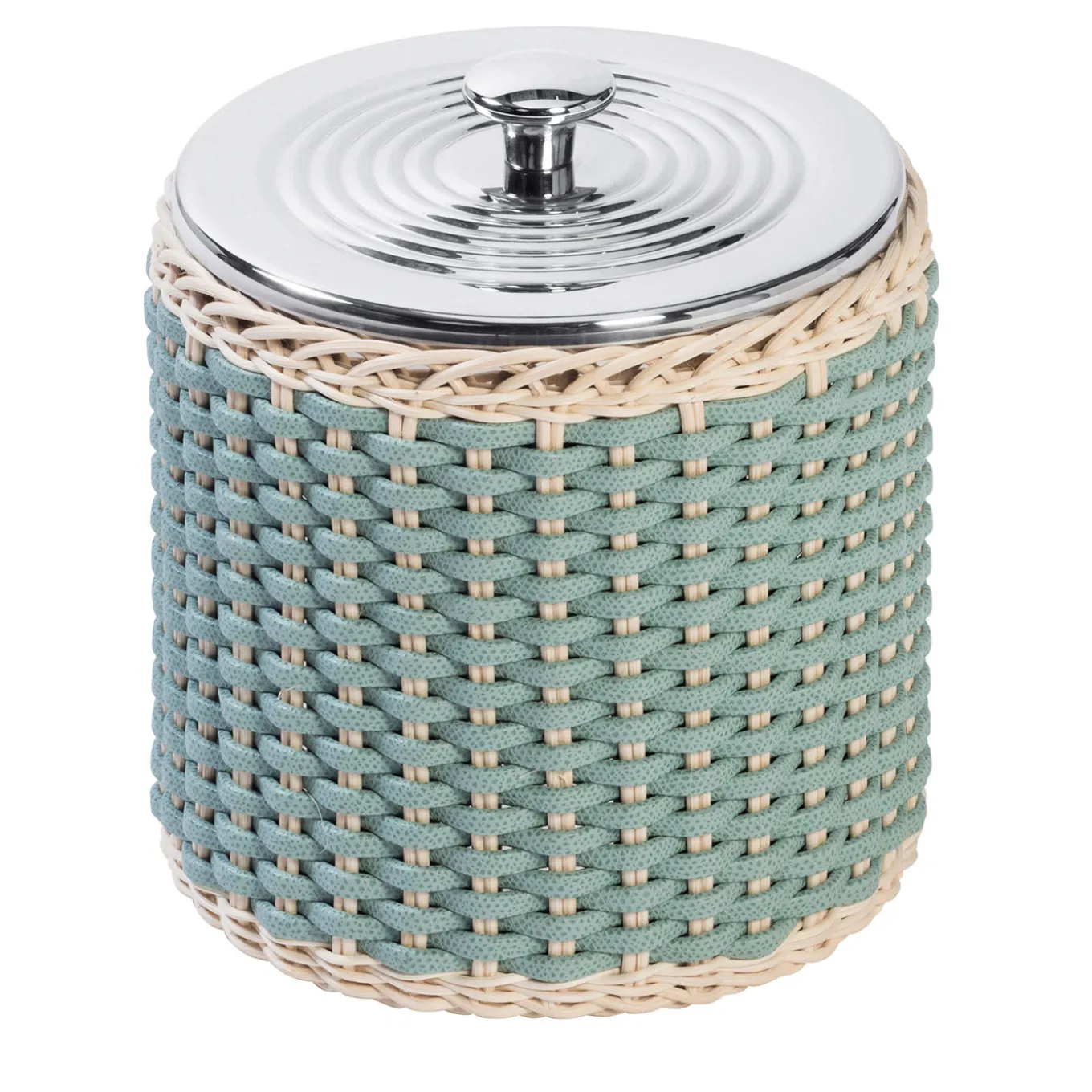 Superbly upholstered in a hand-woven natural rattan and green Napa leather cover, this small ice bucket will make a refined and essential addition to any traditional or modern kitchenware collection. Fashioned of stainless steel, its cylindrical silhouette features an inner double-walled and insulated structure, and is completed with a practical lid with knob.