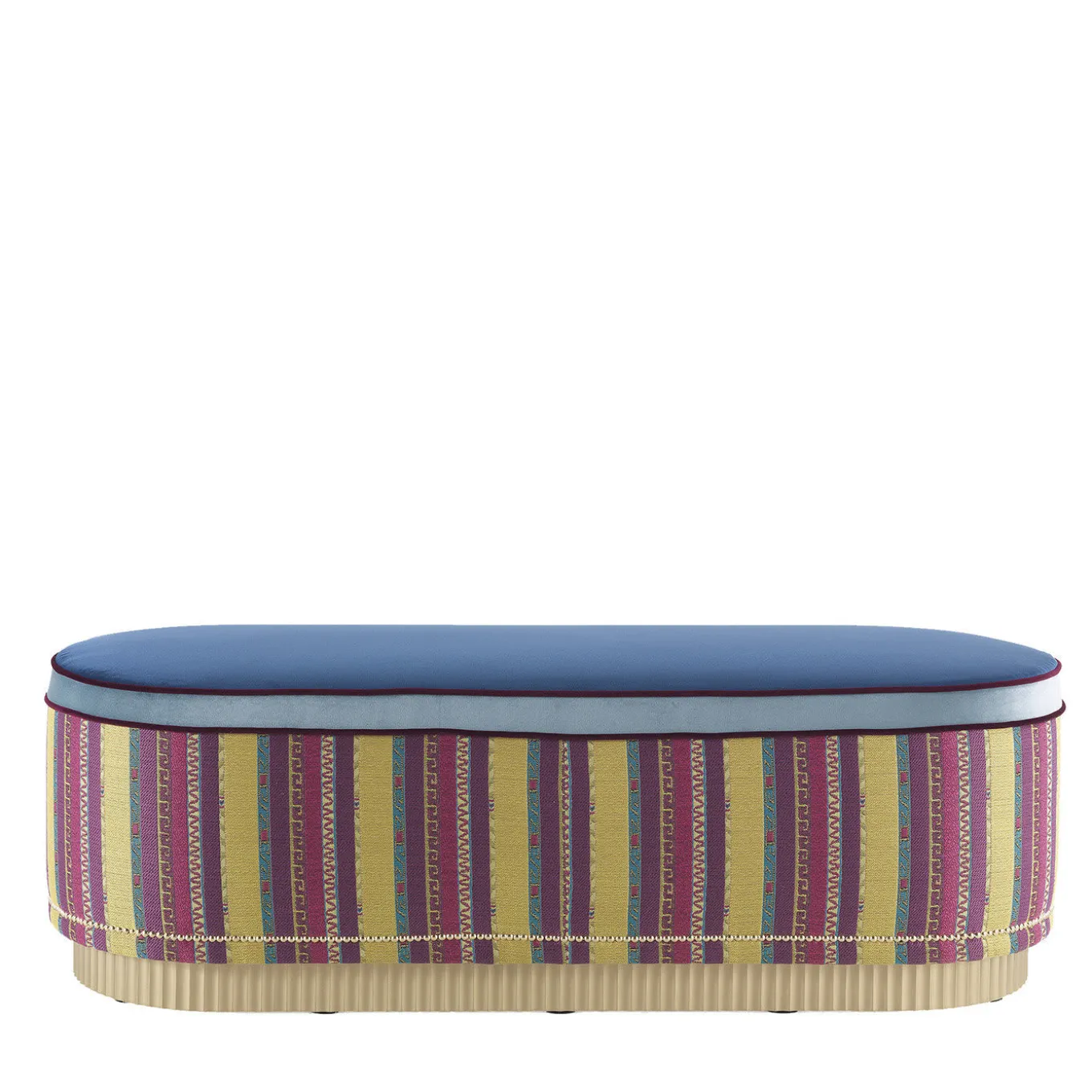 A colorful and creative long pouf to enrich and decorate your relax corner. Available with different upholsteries in the ethnic fabrics of the collection, the pouf is embellished by ornamental golden nails on the bottom and by the pleated gold lacquered base. Structure in wood and foam. Sides in fabric cat. A Khorat col. 1 Overdose. Seat in velvet cat. A Venezia col. 8 Baltic. Under-seat band in velvet cat. A Venezia col. 11 Sky. Piping velvet cat. A Venezia col. 15 Cardinal. Ornamental golden nails on the bottom. Pleated base in gold lacquered wood. Ask the Concierge for customized variants.