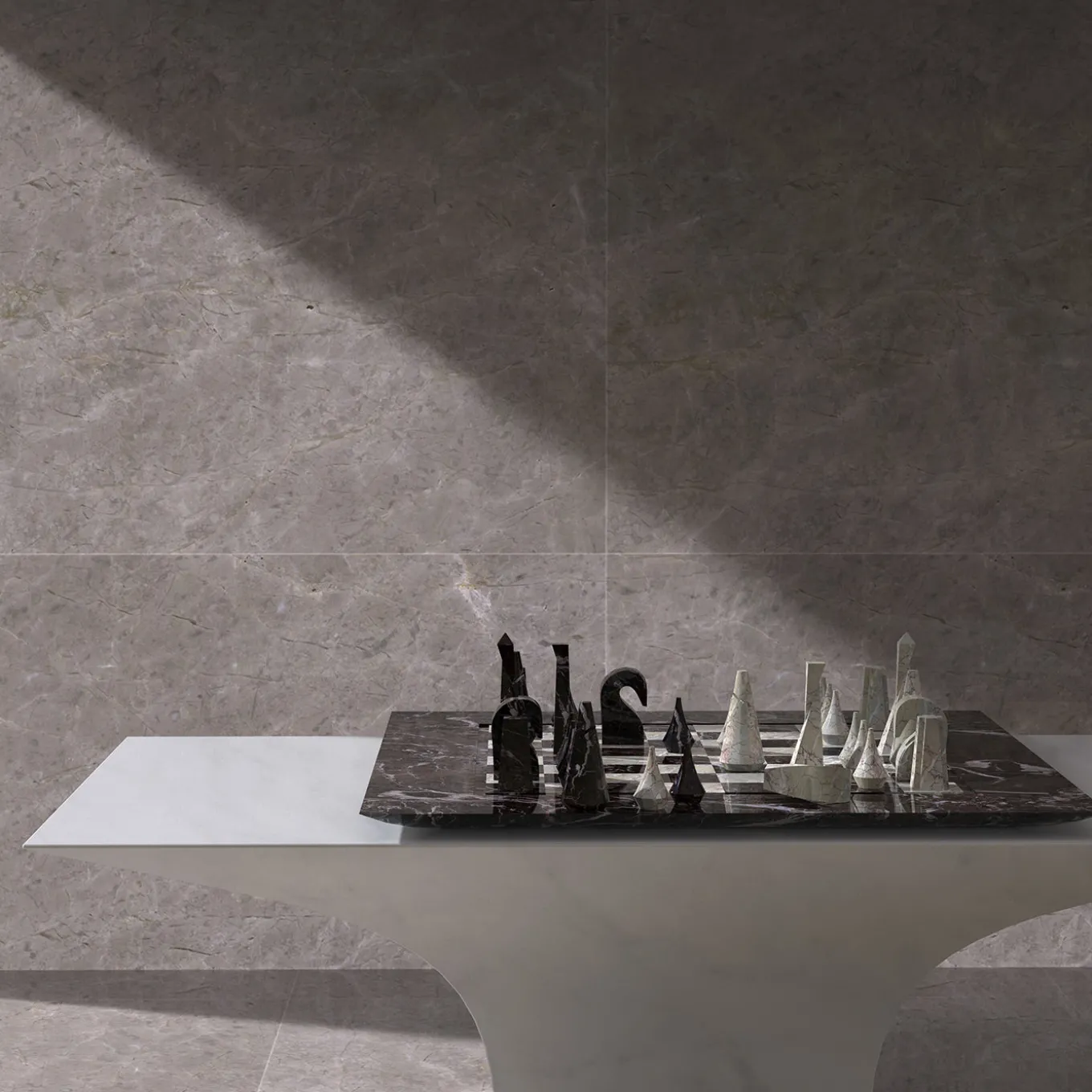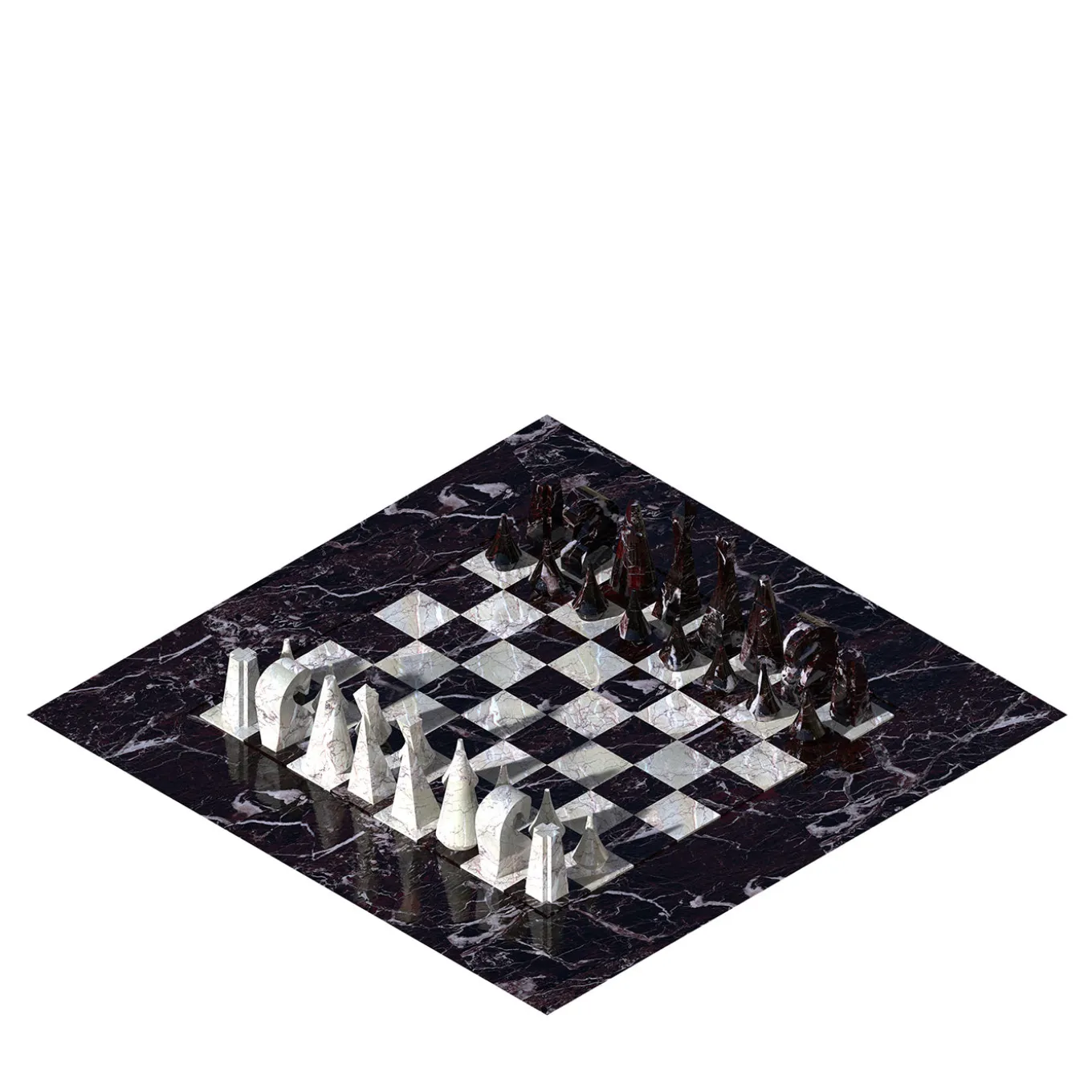 A refined chess set that captures the essence of rivalry and strategy through a striking reinterpretation of traditional chess elements. Each piece is meticulously carved and polished to reveal intricate angular and curved details, representing key figures like knights, rooks, kings, and queens with distinctive stylized forms. Crafted with a sophisticated combination of colored marbles, the board features contrasting squares that enhance the visual impact, making it a timeless and exclusive collectible for enthusiasts and connoisseurs alike.