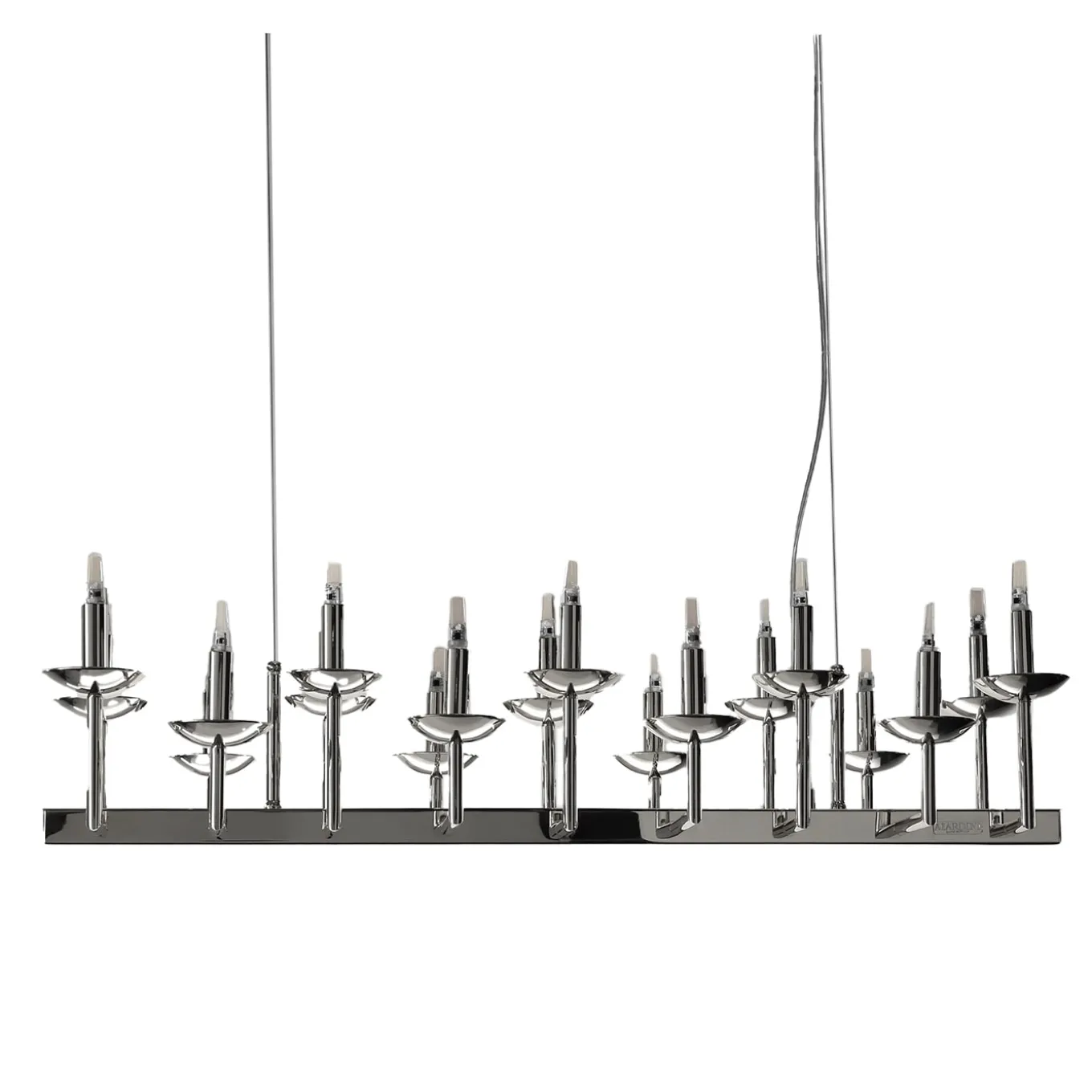 The 2021 new version of the modern chandelier METROPOLITAN by Luigi Aiardo features small L-shaped arms with a sleek and minimal design attached to rectangular modules. METROPOLITAN is one of the Italian brand Aiardini’s bestsellers for luxury interior design projects thanks to the versatility and the wide range of metal finishes available. The chandelier shown is the top-of-the-line 10-light linear suspension model in polished nickel. Please ask the Concierge for further information and options