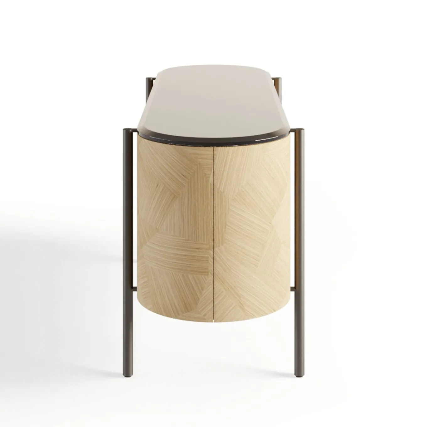 Defined by a flowing oval silhouette ennobled by a Carrara marble top, this sideboard echoes the refined simplicity of Scandinavian style. Four push-pull doors, extensively boasting a refined wheat-toned multilaminar veneer, open to reveal generous shelved storage space finished with a print-proof lacquer. Black nickel cylindrical legs – adapting to irregular floors – complete the design.