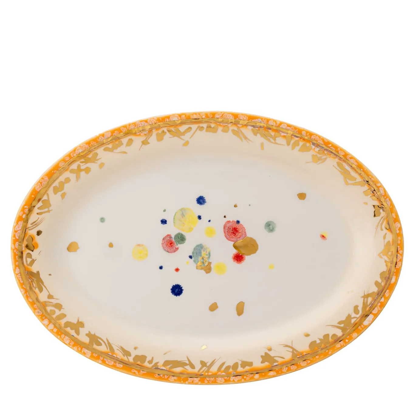 The Miami Serving Platter from the Florida collection, launched in 2023, embodies luxury and cheer. Inspired by the vibrant spirit of Florida, this piece features a bright Miami orange that evokes the lively atmosphere of its famous beaches and sunsets. The design showcases a lightly colored center adorned with playful multicolor dots. Its elegantly finished rim is richly decorated with golden leaves, enhancing its sophistication.