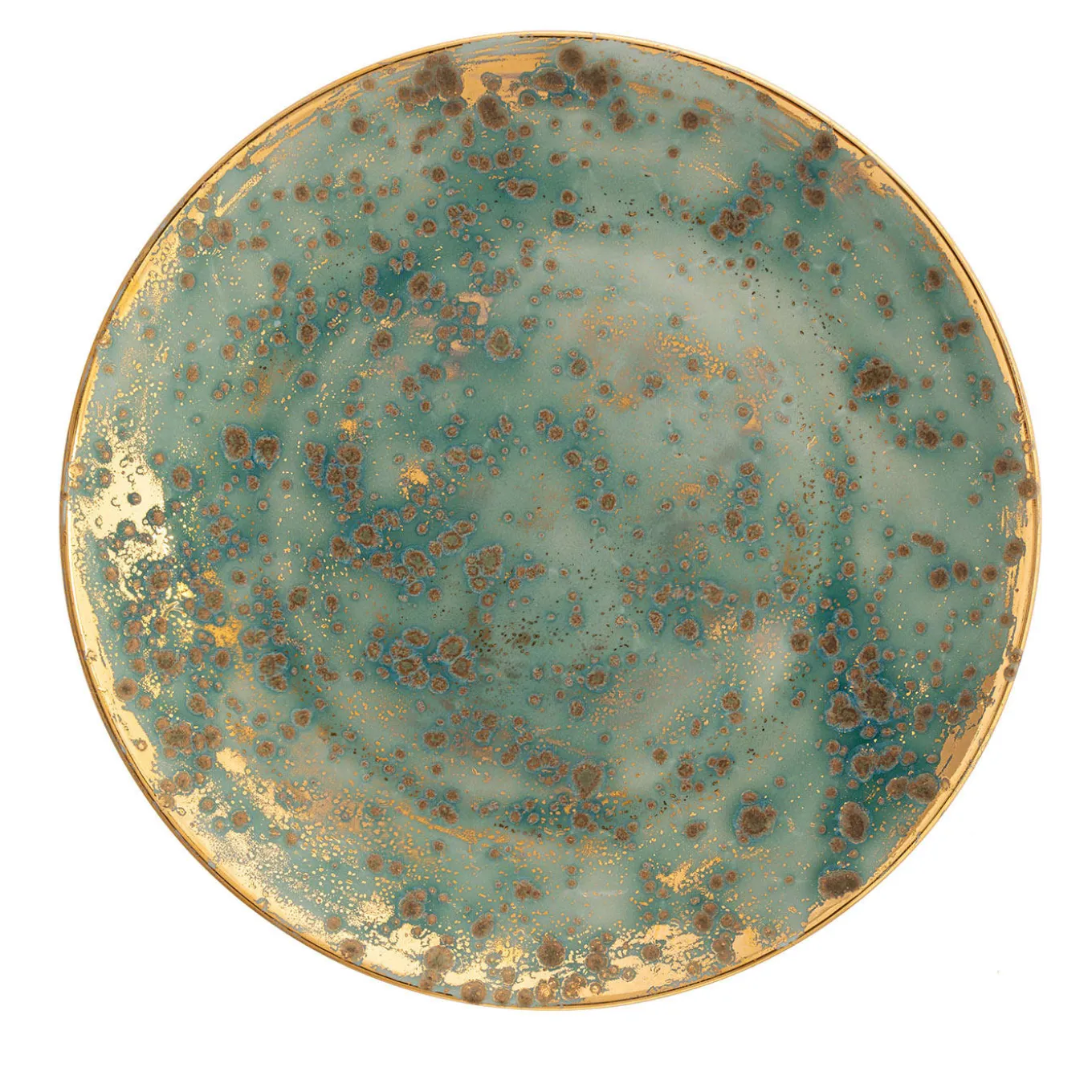 Sophisticated and modern, this set of two dessert plates is a modern take on the earthy dynamism characterizing Michelangelo’s artworks. Fashioned of fine porcelain, the plates feature a background that is hand-painted in dappled green and mottled with golden splotches throughout the surface. The 24K gold leaf rim flaunts an irregular profile, alluding to the unfinished nature of some masterpieces made by the namesake sculptor. Luxe and unique, the set is not microwave safe.
