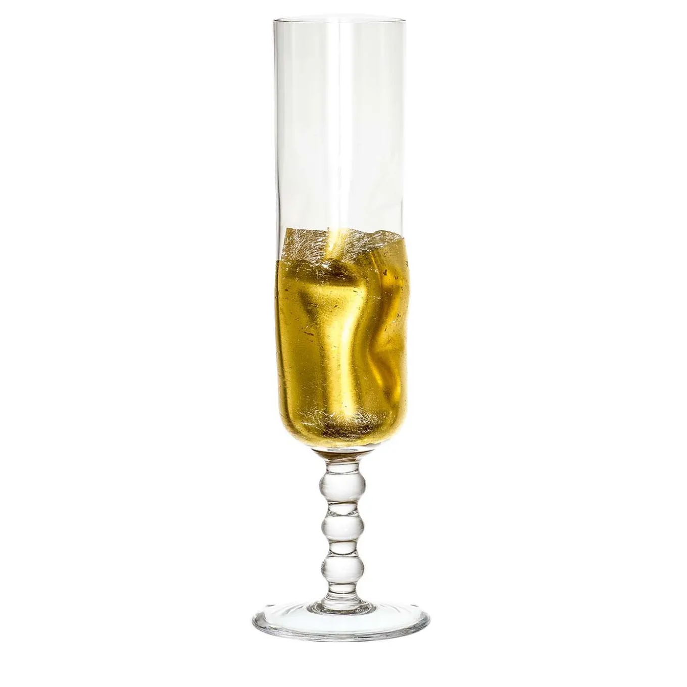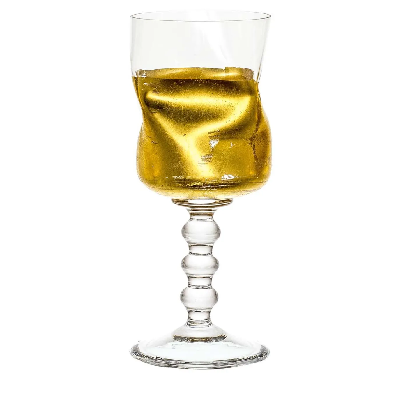 This stylish set of three glasses is composed of a wine glass, stemmed water glass, and a flute, its combined aesthetic infusing sophistication to any table setting. The eye-catching, crumpled design of the bowls is enhanced by the irregular application of a thin layer of gold, which is expected to elegantly wear out in some areas. Rising from the round base, the glasses’ stem displays a sinuous silhouette reminiscent of necklaces’ ball chains.