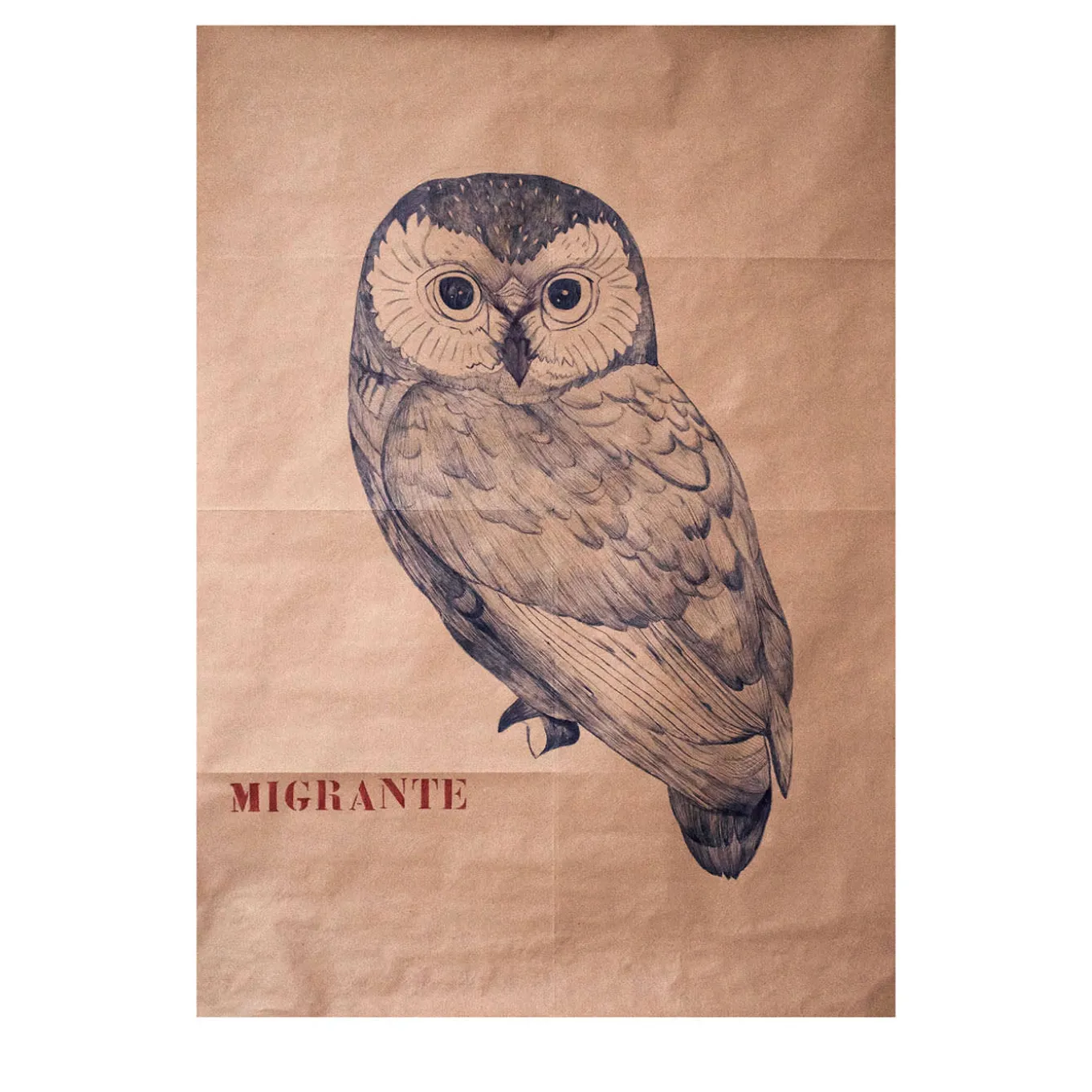 Minutely traced with a pen on wrapping paper, this singular drawing belongs to the 2022 “Corale Corviale” artistic residence program celebrating the value of migrants. The deft drawing of an owl is flanked by a stamp with the Italian for migrant, and underscores the irony how one of Roma’s deteriorating public housing projects is build atop where a pantheistic temple once stood which celebrated animals.