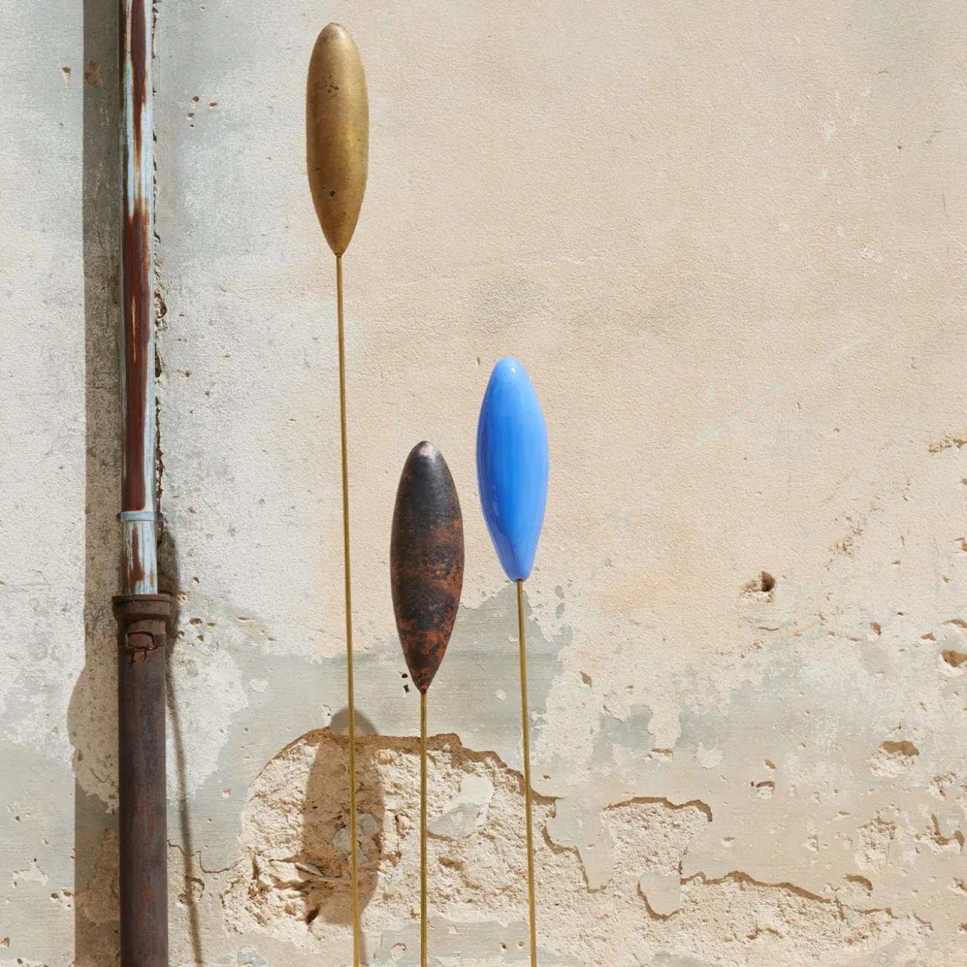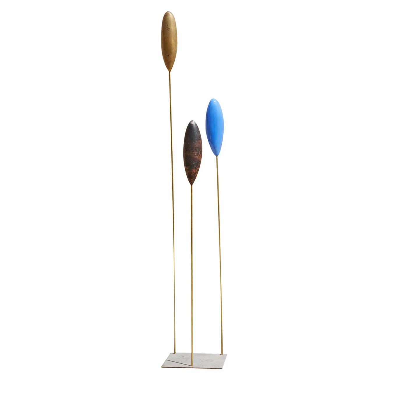 Totem pole with brass, embossed copper, and ceramic elements. Composed of three brass tubes and elements that can be made of blue ceramic glazed, embossed brass, and embossed copper. It is entirely modular and the heights of the tubes are variable. Also available with only the brass and copper elements.