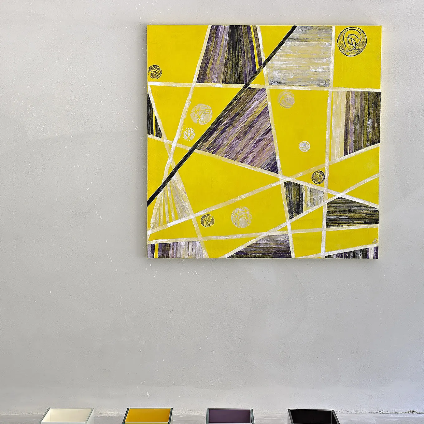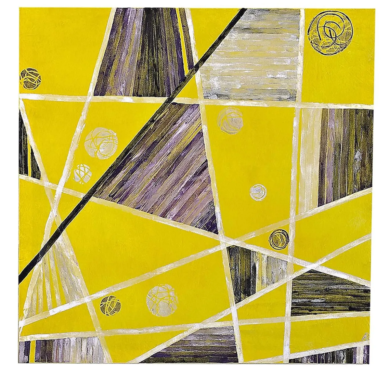 An exquisite piece of refined sophistication, this tapestry is superbly crafted and painted by hand using techniques inspired by old Venetian tapestry tradition and natural materials. It features a silk velvet canvas assembled on a wooden frame, and decorated with a black and white geometric composition of lines, triangles, and circles on a yellow background.