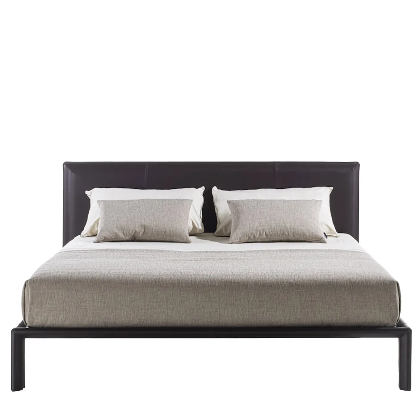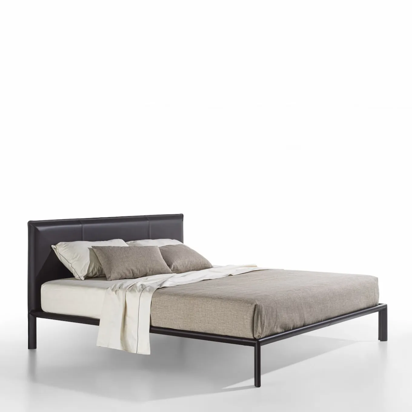Unique bed with oval-section tubular metal frame, available in various covered or painted finishes. The headboard is upholstered in leather, offering a touch of luxury and comfort. This bed combines modern design and high-quality materials, making it a distinctive element for any bedroom. Elegant and refined, it is designed for those seeking style and functionality in one piece of furniture. Perfect for contemporary and sophisticated settings.