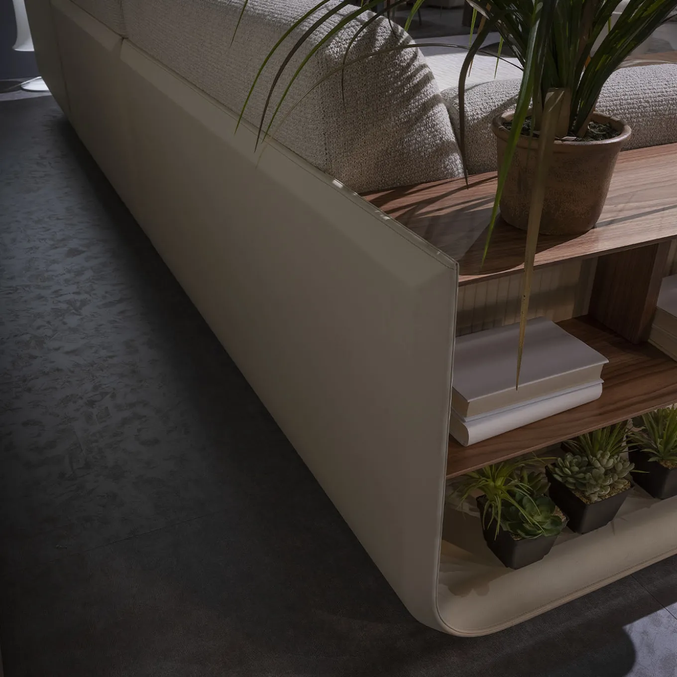 The Milano modular corner sofa combines minimalist design with generous, harmonious forms for ultimate relaxation and style. Featuring a curved wooden frame upholstered in fine leather and large modular cushions, it adapts seamlessly to various spaces. An exclusive version integrates a side table into the armrest, adding functional character without compromising sophistication. Tailored cushion finishes and the elegant contrast between wood and leather exemplify refined craftsmanship.