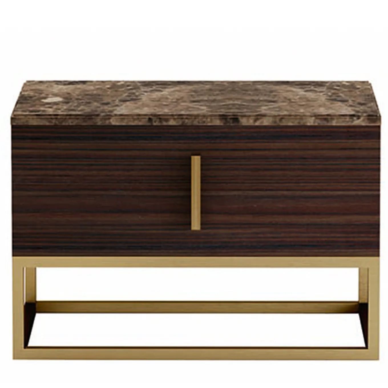 A simple and elegant addition to your contemporary bedroom furnishings, the Milano Side Table is crafted from plywood with a dark walnut veneer in a brushed gloss finish. The fully lined drawers are on soft metal runners and the brass base and handles are finished in a burnished brass effect, all beautifully combined with an emperador marble top (CAT. A).